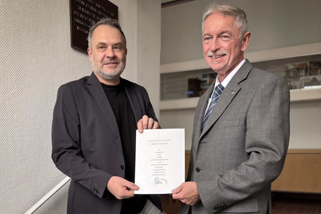 Heiligenhaus. Am Dienstag, 28. Oktober 2025, ist Kai Angermann, Musikschullehrer der Stadt Heiligenhaus, für sein 25-jähriges Dienstjubiläum geehrt worden. Bürgermeister Michael Beck sprach dem 1972 in Nürnberg geborenen Musiker seine Glückwünsche aus und würdigte dessen umfangreichen Beitrag zum kulturellen Leben der Stadt.