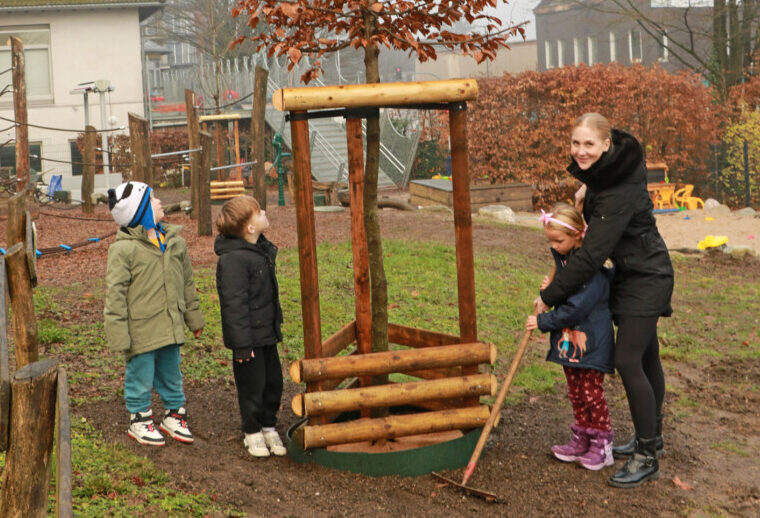Für die Kinder wird das neue Grün schon bald sichtbar und erlebbar sein: Drei größere Bäume – eine Hainbuche, eine Weide und ein Feldahorn – sorgen künftig für natürlichen Schatten und ein angenehmes Mikroklima. Die schnellwüchsige Weide bietet darüber hinaus biegsame Zweige, die sich hervorragend zum Basteln eignen.