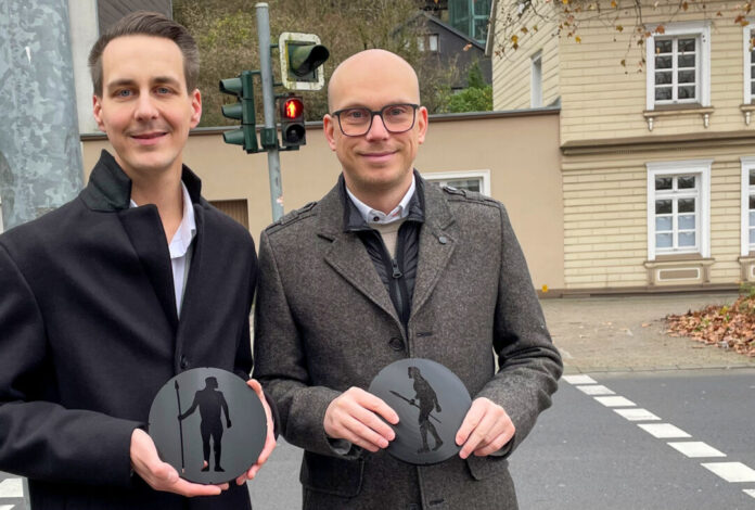Bürgermeister André Bär und Fabian Kippenberg präsentieren die Schablonen mit den NeandertalerAmpelmännchen. Foto: Kreisstadt Mettmann
