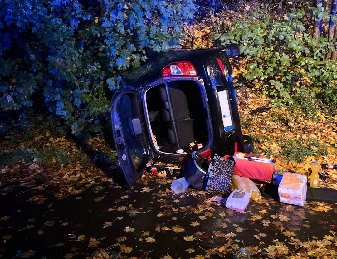 Auch ein hinter dem Hyundai fahrender, 21-jähriger Wülfrather verlor auf der nassen Fahrbahn bei einem Ausweichmanöver die Kontrolle über seinen VW Up und schleuderte in ein Gebüsch.