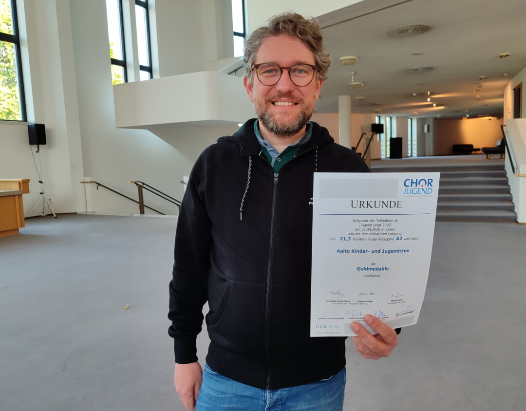Essen. Ein Erfolg für den Aalto-Kinderchor: Beim Landeswettbewerb „Jugend singt 2026“ der Chorjugend NRW durfte sich das von Patrick Jaskolka geleitete Vokalensemble über den Gewinn einer Goldmedaille freuen.