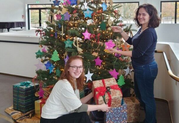 Der Wunschbaum im Essener Aalto-Theater soll Kinderaugen zum Leuchten bringen: Die Kulturvermittlerinnen des Aalto-Theaters, Julia Schreiber und Katharina Blanke, mit ersten Päckchen. Foto: TUP