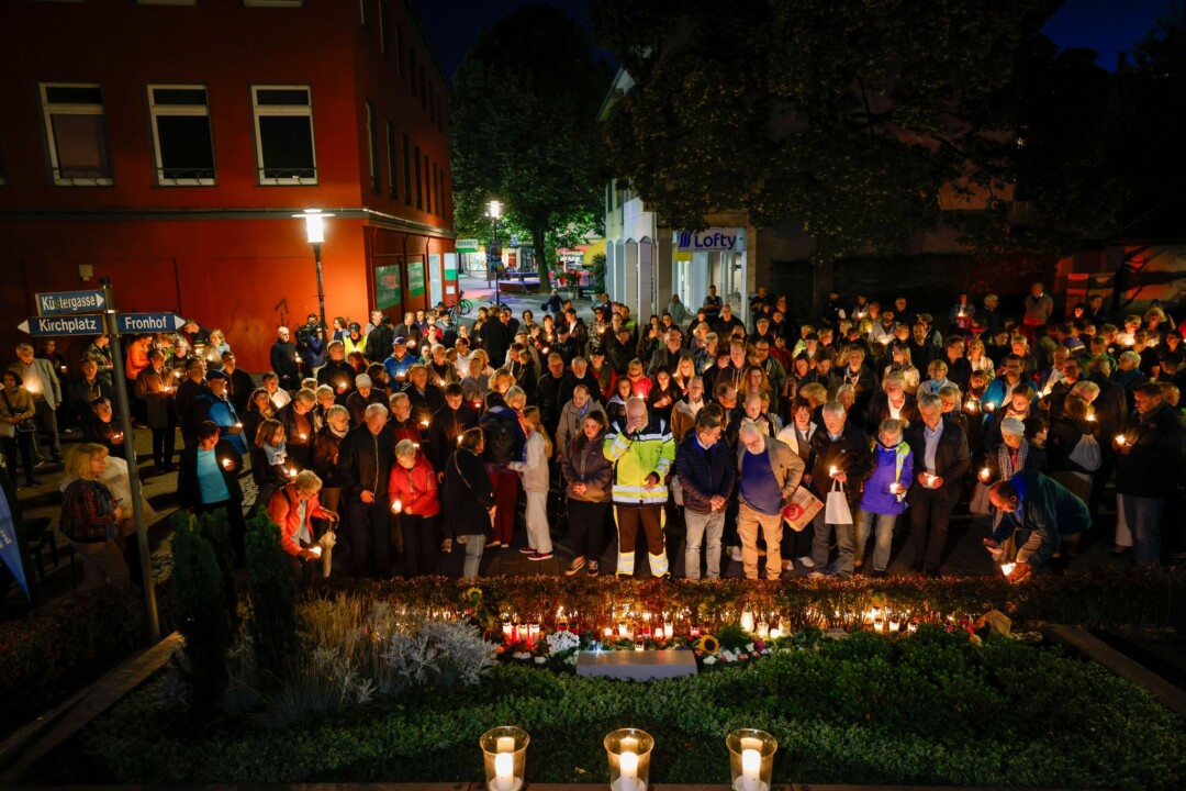 Mit Kerzen versammelten sich am Abend Hunderte Menschen zu einer Trauerfeier an der Gedenktafel vor der evangelischen Stadtkirche am Fronhof – drei Glockenschläge und dann ein Moment der Stille zur Tatzeit.