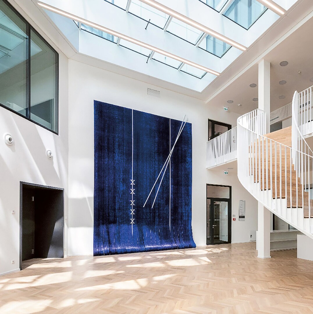 Bei dem Auftragswerk einer Kölner Künstlerin handelt es sich um einen blauen Wandteppich mit LED-Elementen.