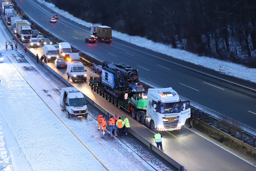Wie die Polizei mitteilte, handelte es sich bei dem Lastwagen um einen Schwertransport. Die Bergung des Fahrzeugs war sehr aufwendig. Am Morgen konnte der Lastwagen so versetzt werden, dass der Verkehr hinter ihm wieder ins Rollen kam, wie ein Sprecher sagte.