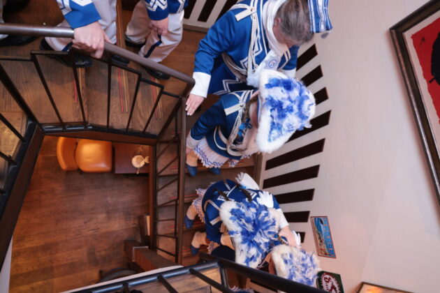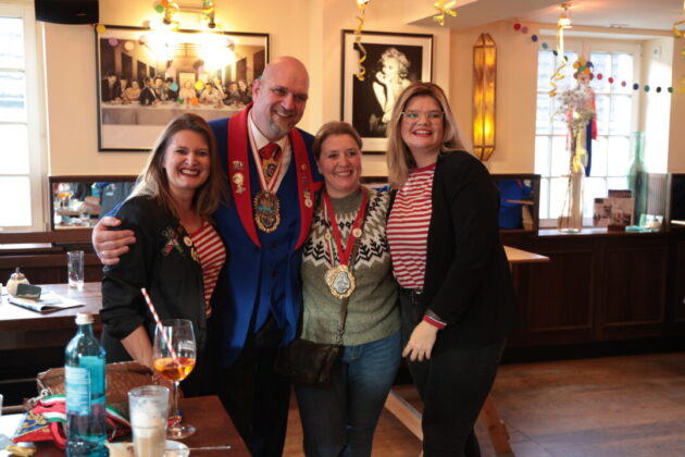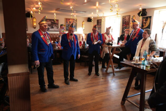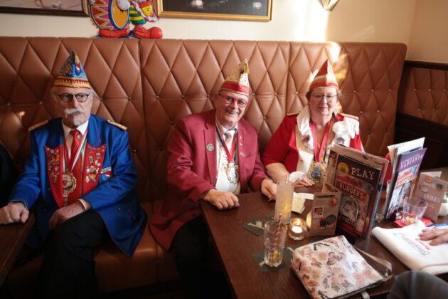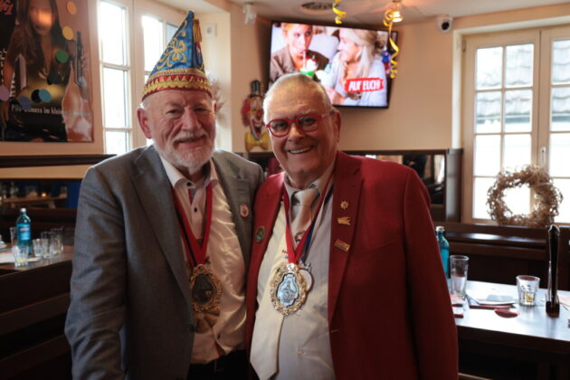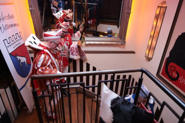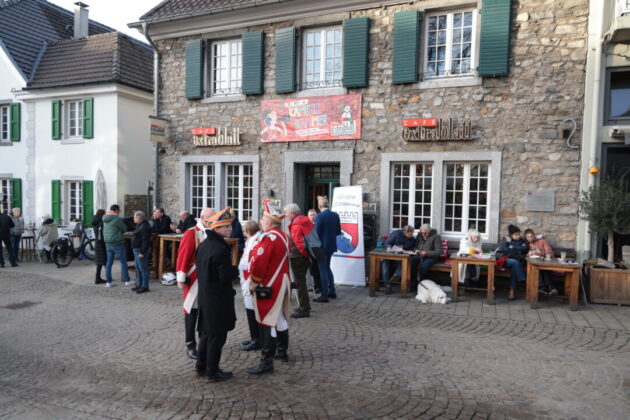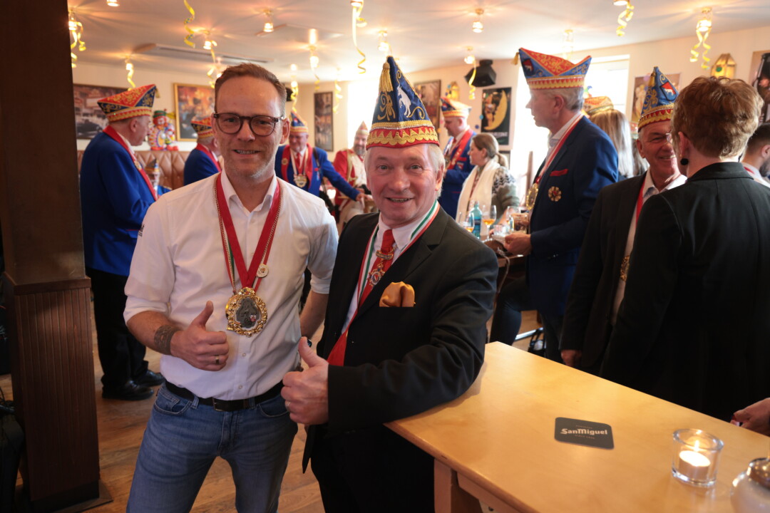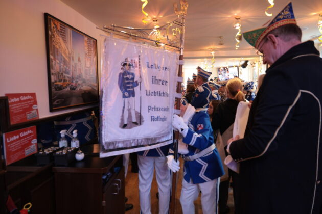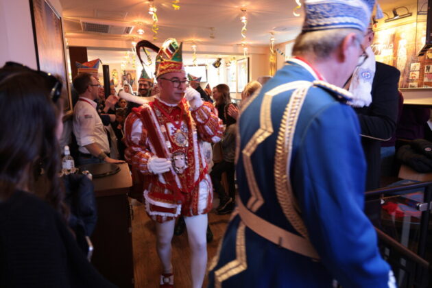 Wie lebendig diese Tradition bis heute ist, zeigte sich am Wochenende im Café Extrablatt am Marktplatz: Dort ging es „heiß her“ – weniger wegen der „feurigen Reden“ als wegen der schieren Besucherzahl. Birger Thurmann, Betreiber des Extrablatts, staunte nicht schlecht, als die Prinzenbegleitung von Blau-Weiss mit dem Stadtprinzenpaar Prinz Jörg I. und Ratingia Claudia III. in den oberen Raum folgte. „Unglaublich, dass die alle noch Platz gefunden haben“, sagte er, nachdem der Auszug „schier nicht enden wollte“. Vereinschef Dr.-Ing. Hubertus Brauer, der gewohnt eloquent durch die Veranstaltung führte, blieb selbst nach dem Abgang des Prinzenpaares noch zu Späßen aufgelegt – und machte deutlich: Die Vorfreude auf die Session ist bei Blau-Rot längst Programm.