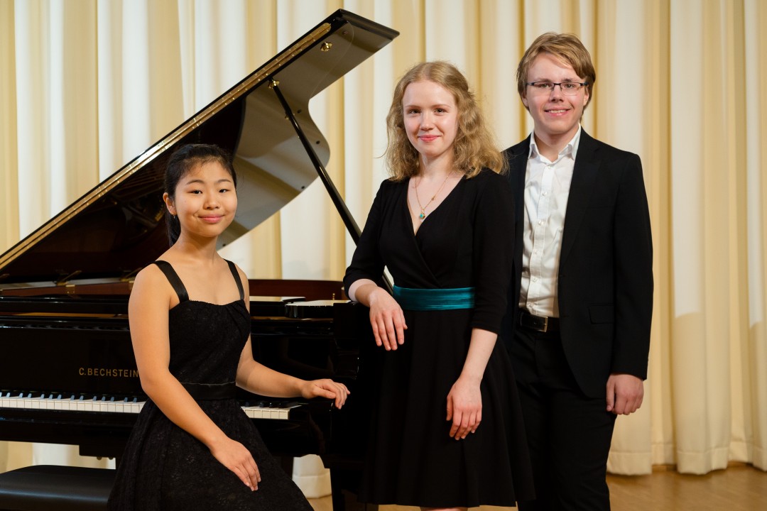 Yumeka Nakagawa (links) gewann den Ferdinand-Trimborn-Förderpreis 2017 am Klavier vor Joanna Sielicka (Mitte) und Erik Breer (rechts). Foto: Christoph Schönbach