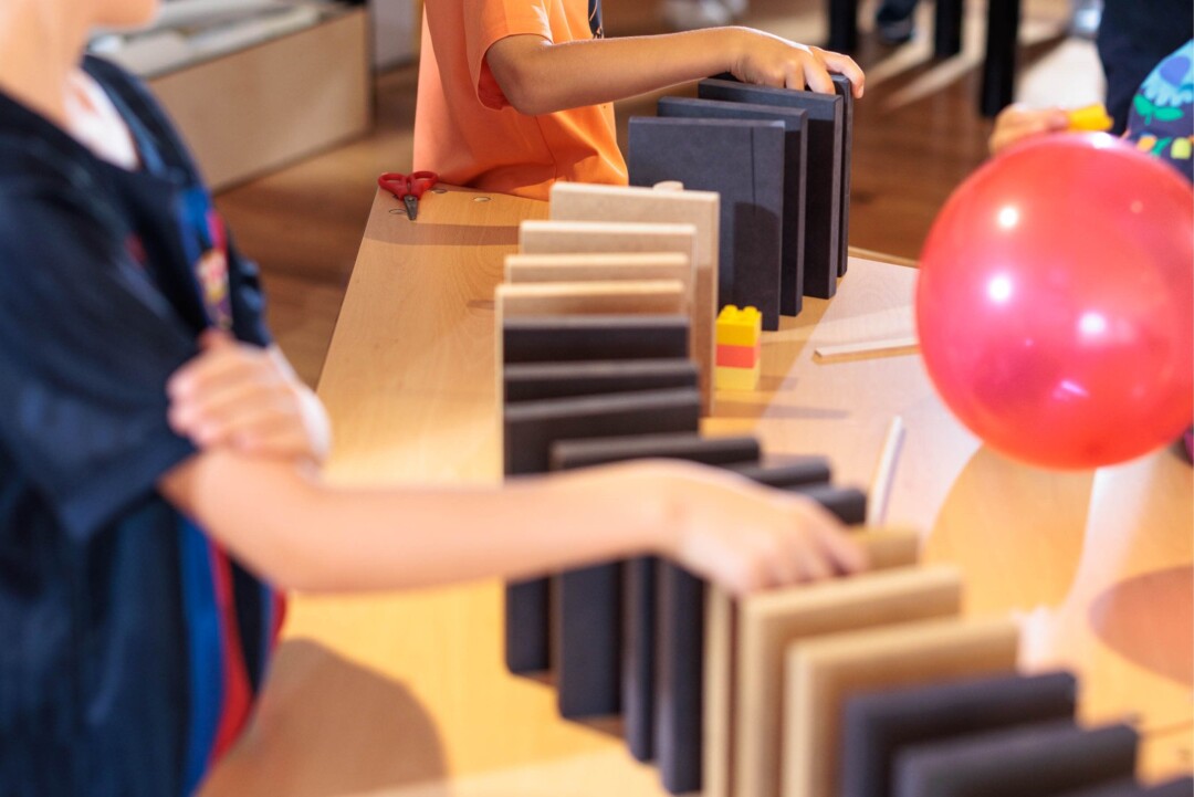 Im Vordergrund steht das Tüfteln: Eine Magnetwand, ein Parcours und allerlei Materialien liefern die Kulisse zum gemeinsamen Bau einer Kettenreaktion. Ausgestattet mit Zahnrädern, Kugeln, Spulen, Bausteinen, Schnüren, Wäscheklammern, Eierkartons, Rohren, Klebeband, Gummibändern und vielem mehr wird die Bewegung von Abschnitt zu Abschnitt weitergegeben, sodass eine große Kettenreaktion in Gang gesetzt wird. Hierbei können sich Groß und Klein kreativ austoben und das Teamgefühl stärken.