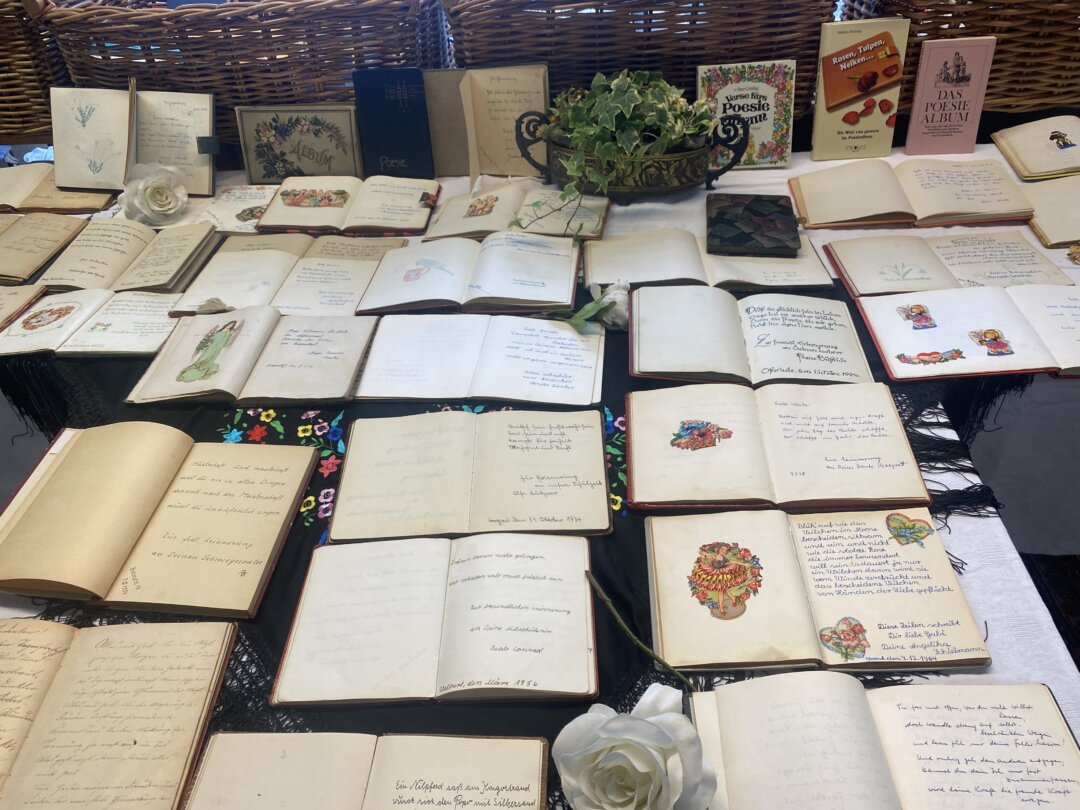 Seit dem Januar sind im Antiquariat Bücherquelle viele wunderbare mehr- und weniger- alte Poesiealben (leihweise) abgegeben und ausgestellt.