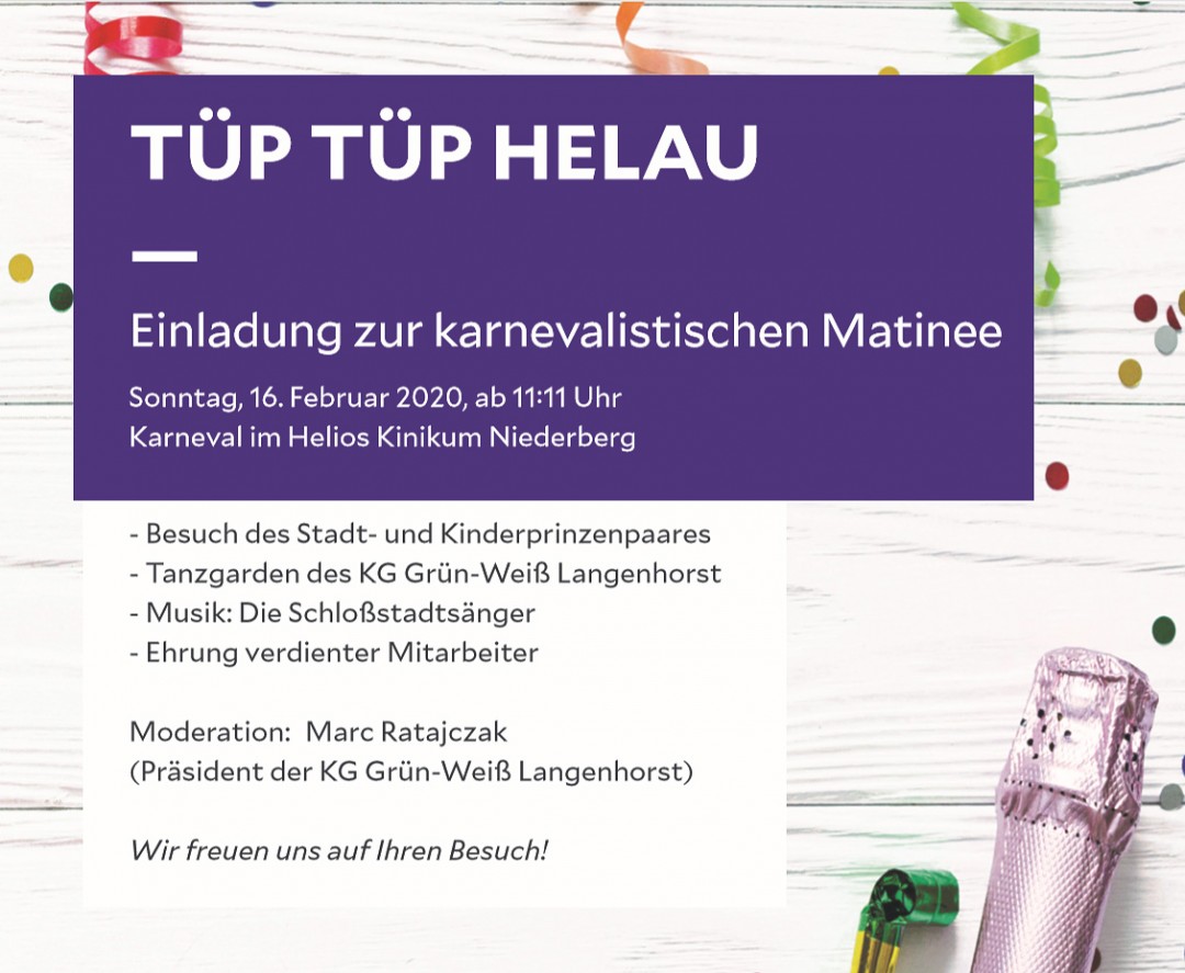 Velbert. Am Sonntag, 16. Februar, herrscht im Foyer des Helios-Klinikums Niederberg Karnevalsstimmung, wenn dort Patienten, Besucher und Mitarbeiter gemeinsam im Rahmen der karnevalistischen Matinee feiern.