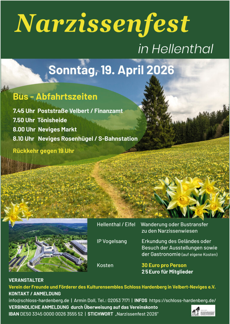 Anmeldungen sind ab sofort telefonisch unter 02053/7171 oder per E-Mail an info@schloss-hardenberg.de möglich. Benötigt werden die Namen der Teilnehmenden, eine Telefonnummer für eventuelle Rückfragen sowie der gewünschte Zustiegspunkt. Verbindlich wird die Anmeldung mit der Überweisung des Teilnahmebeitrages auf das Konto des Fördervereins: IBAN DE 50 3345 0000 0026 3555 52 mit Vor- und Zuname und dem Stichwort „Narzissenfest 2026“ sowie Zusteigepunkt.