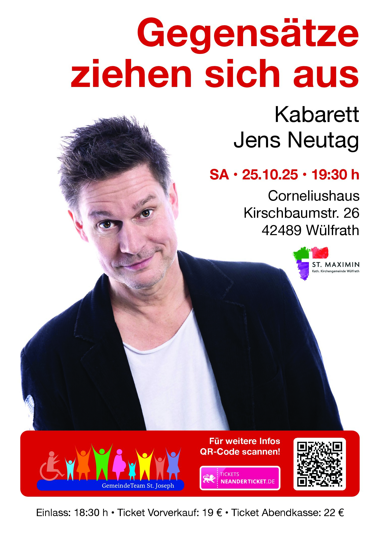 Wülfrath. Das “GemeindeTeam” St. Joseph lädt ein zu einer Kabarettveranstaltung mit Jens Neutag. Titel “Gegensätze ziehen sich aus – ein Kabarett oberhalb der Gürtellinie”.