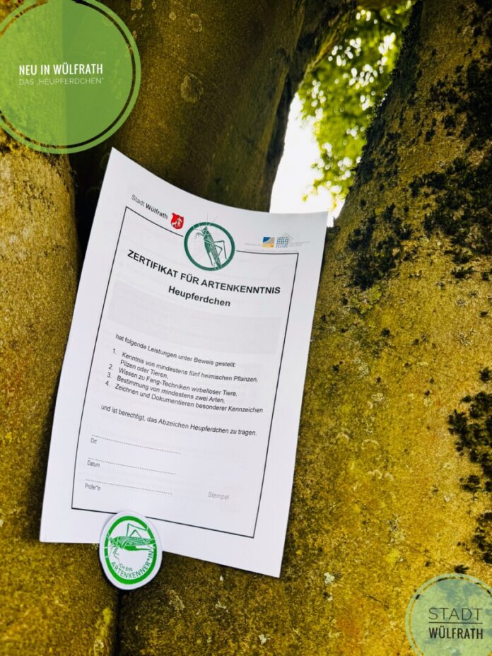 Wülfrath. Das Projekt „Heupferdchen“ wird in Wülfrath eingeführt. Kinder und Jugendliche können ein Zertifikat mit Aufnäher erhalten, wenn sie Kenntnisse über heimische Tiere, Pflanzen oder Pilze nachweisen.