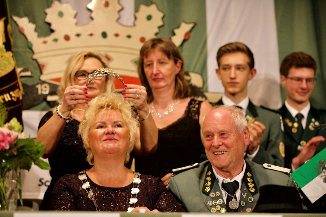 Zum Abschluss des offiziellen Teils wurde dann gegen 21.20 Uhr das neue Königshaus gekrönt. In einer feierlichen Zeremonie zollte Lutz Michael dem abdankenden Königspaar Ulrich und Renate Klückmann große Hochachtung und würdigte den vorbildlichen Einsatz in ihrem Regentschaftsjahr mit großem Dank. Die äußeren Zeichen ihrer Würde empfingen Angela Peters und Jochen Rusche und wurden unter dem Beifall im Festsaal als Königin Angela I. und Prinzgemahl Jochen Rusche in Amt und Würden eingesetzt. Zu ihrem Hofstaat gehören Volker Schneider als Adjutant und Monika Rebien und Doris Dahm als Ehrendamen.