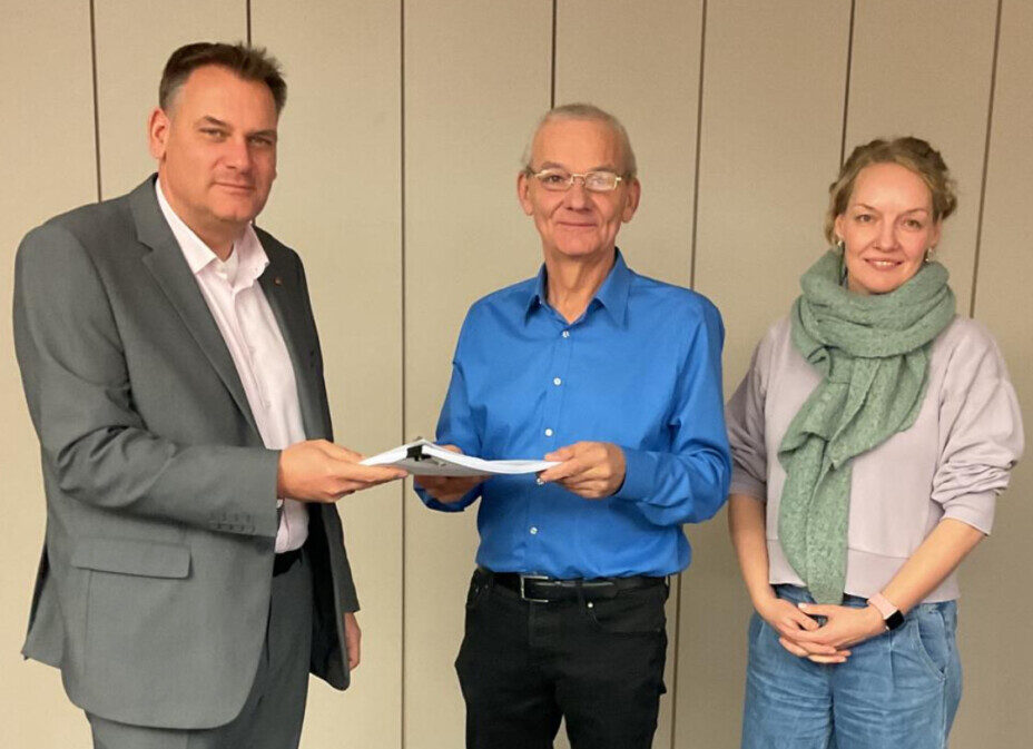 Bürgermeister Schorn nimmt die Petition von Dr. Hans Jörg Scheven und Alice Bruchhaus-Peter entgegen. Foto: Initiative