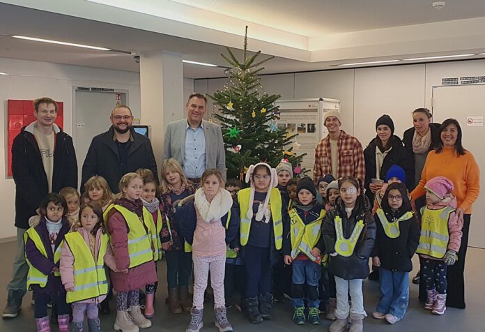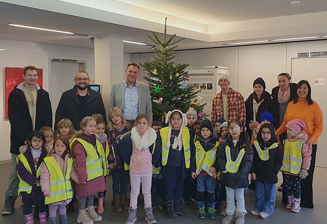 Die Mädchen und Jungen brachten zahlreiche selbst gebastelte Anhänger mit, die sie in den Tagen zuvor gemeinsam mit ihren Erzieherinnen und Erziehern gestaltet hatten. Der Baum ist nun mit bunten Sternen, Lebkuchenfiguren und verschiedenen kleinen Kunstwerken dekoriert und bildet einen Blickfang im Eingangsbereich des Rathauses.