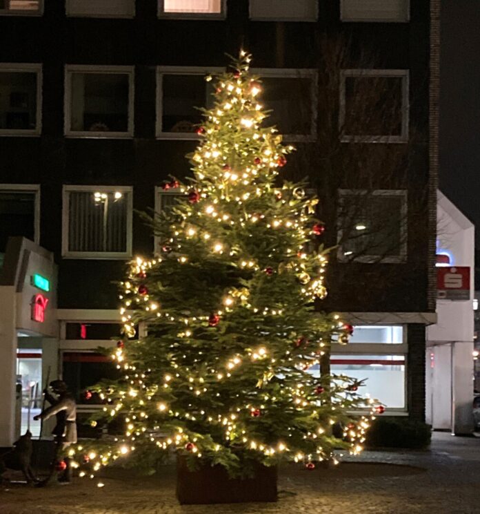 Wülfrath. In der Innenstadt erstrahlt auch in diesem Jahr wieder ein festlich geschmückter Weihnachtsbaum vor der Kreissparkasse Düsseldorf. An zentraler und gut sichtbarer Stelle sorgen zahlreiche Lichter, rote Kugeln und goldene Schleifen für weihnachtliche Akzente im Stadtbild.