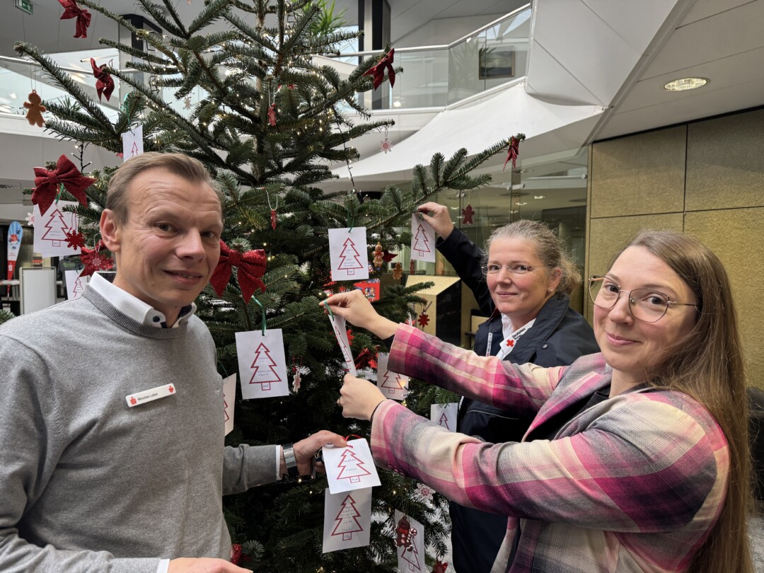 Miroslaw Lubos (Leiter Beratungs-Center Wülfrath), Inga Henning-Finke (Wülfrather Kinder in Not) und Natali Zimny (Caritas) bei der Vorstellung des Wunschbaums in der Wülfrather Kundenhalle. Foto: Sparkasse