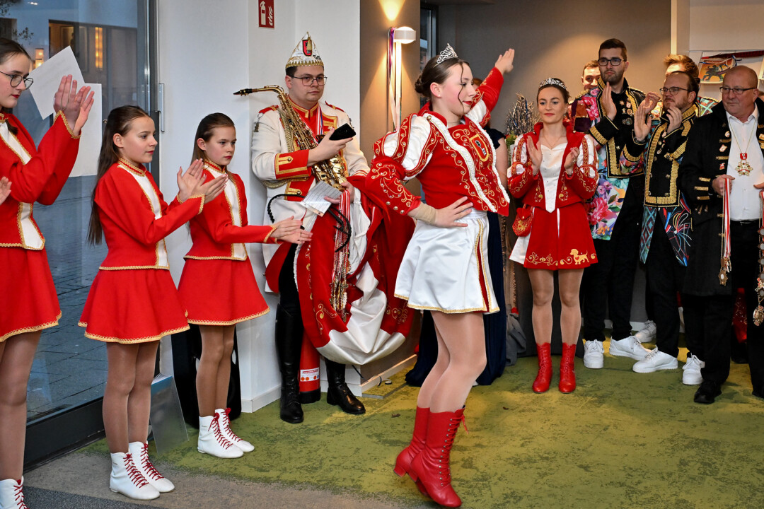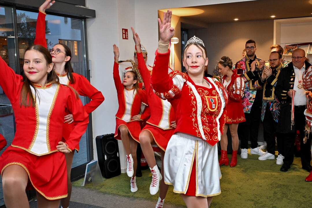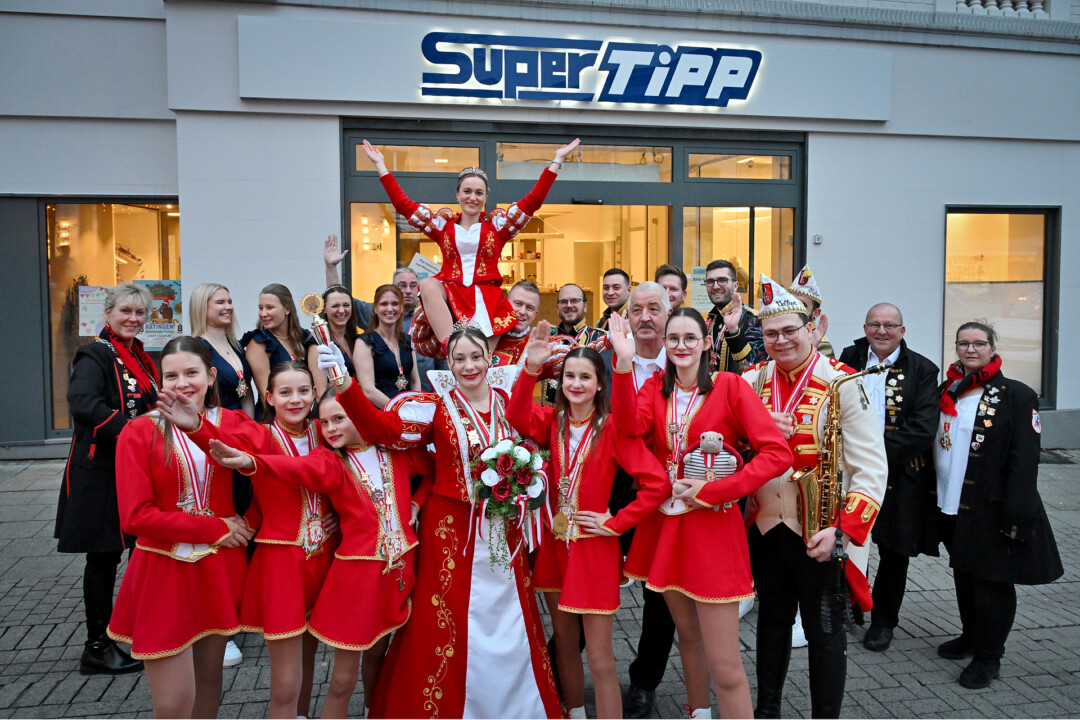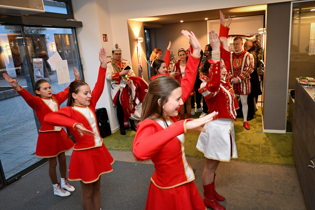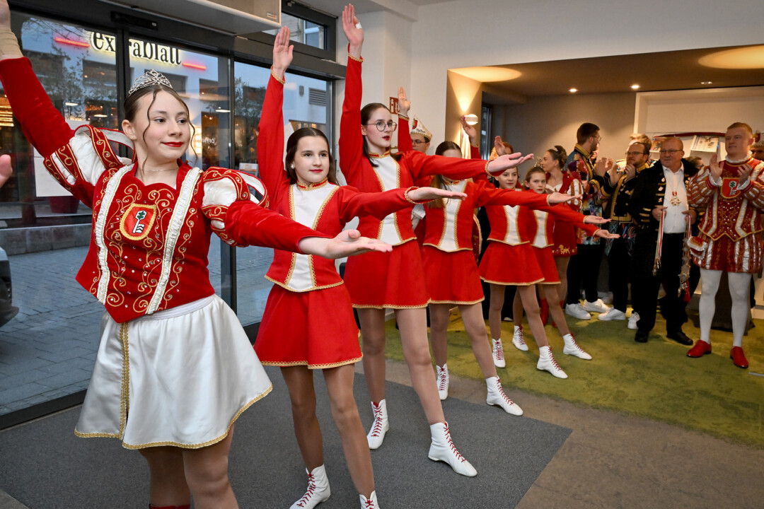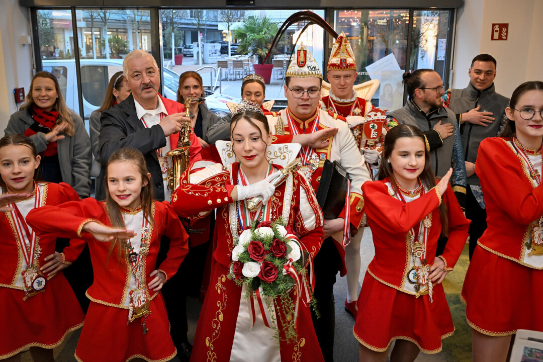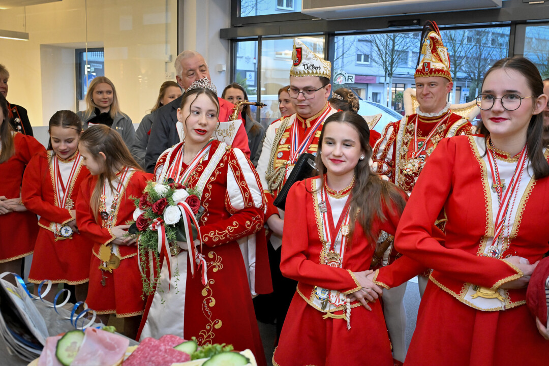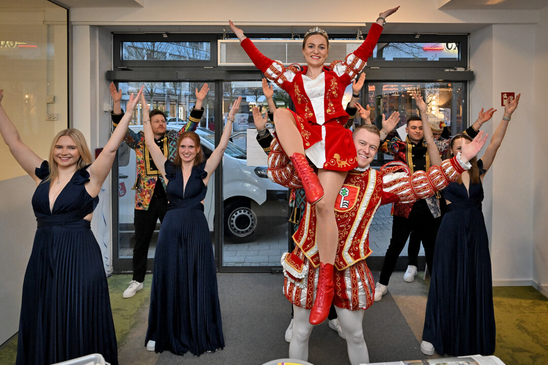 Statt Blau und Weiß dominierten am Mittwoch beim Super Tipp an der Friedrichstraße die Farben Rot und Weiß – das Prinzenpaar Julian I. und Lina I. und Kinderprinzessin Valeria I. waren samt Gefolge zu Gast im Verlagsbüro. Nach der Begrüßung und den obligatorischen Tanzeinlagen plauderten die Tollitäten über das, was ihnen die fünfte Jahreszeit bislang beschert hat. Spannend und nicht nicht so anstrengend sei die Session bisher verlaufen, blickt Prinz Julian I. auf das Erlebte zurück. “Es ist interessant zu sehen, wie um uns herum gefeiert wird, vor allem wenn man nur den Karneval aus Velbert kennt”. Prinzessin Lina I. war beeindruckt von einem Besuch bei der Kreispolizeibehörde in Mettmann – “Da sind wir richtig durchgeführt worden” – und der Fahrt nach Berlin. Letztere Aktion zeigt, dass die Prinzenpaare zwar vor allem, aber nicht nur, als Stimmungsmacher unterwegs sind, sondern Stadtfarben und Wappen durch die Region und eben darüber hinaus tragen. Die Stippvisite im Bundestag blieb jedenfalls nicht lange unbemerkt.