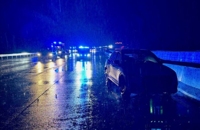 Zwei Autos waren beteiligt, deren Trümmer sich über rund 200 Meter verteilten. Zusätzlich hatte sich auf der linken Fahrspur Regenwasser in etwa 15 Zentimetern Höhe auf einer Länge von circa 120 Metern angesammelt. Besondere Gefahr ging von einem herausgerissenen Fahrzeugrad aus, das mehrere hundert Meter über die Fahrbahn geschleudert wurde.