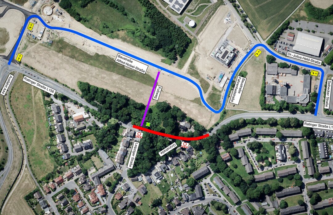 Ein Möglichkeit die Baustelle zu umfahren, gibt es auf folgender Umleitung: von der Ratinger Straße über die Alfred-Nobel-Straße, die Fahrenheitstraße, die Dr.-Julius-Held-Straße und die Selbecker Straße wieder zurück auf die Ratinger Straße. Die Strecke ist jedoch mit Vorsicht zu befahren, weil die Straßen teilweise noch Baustraßen sind, heißt es von der Verwaltung abschließend.
