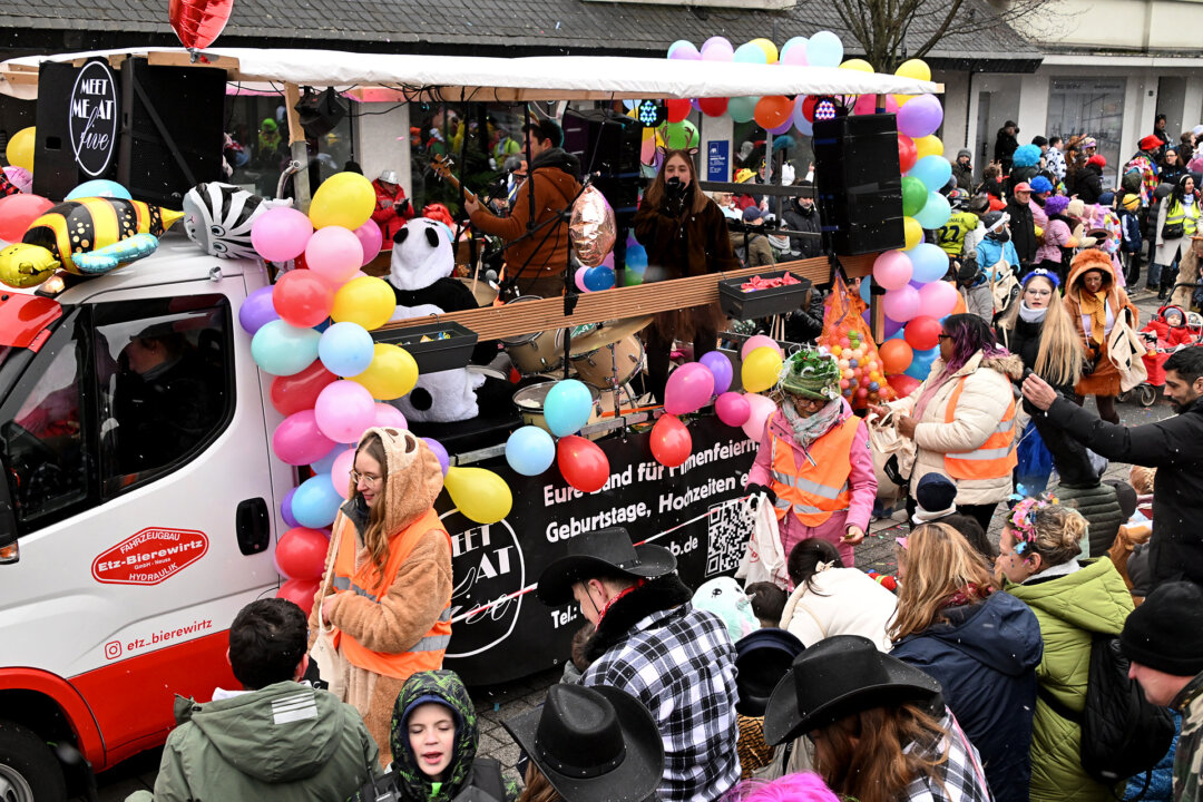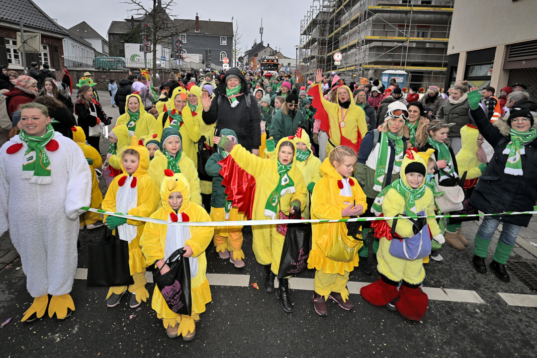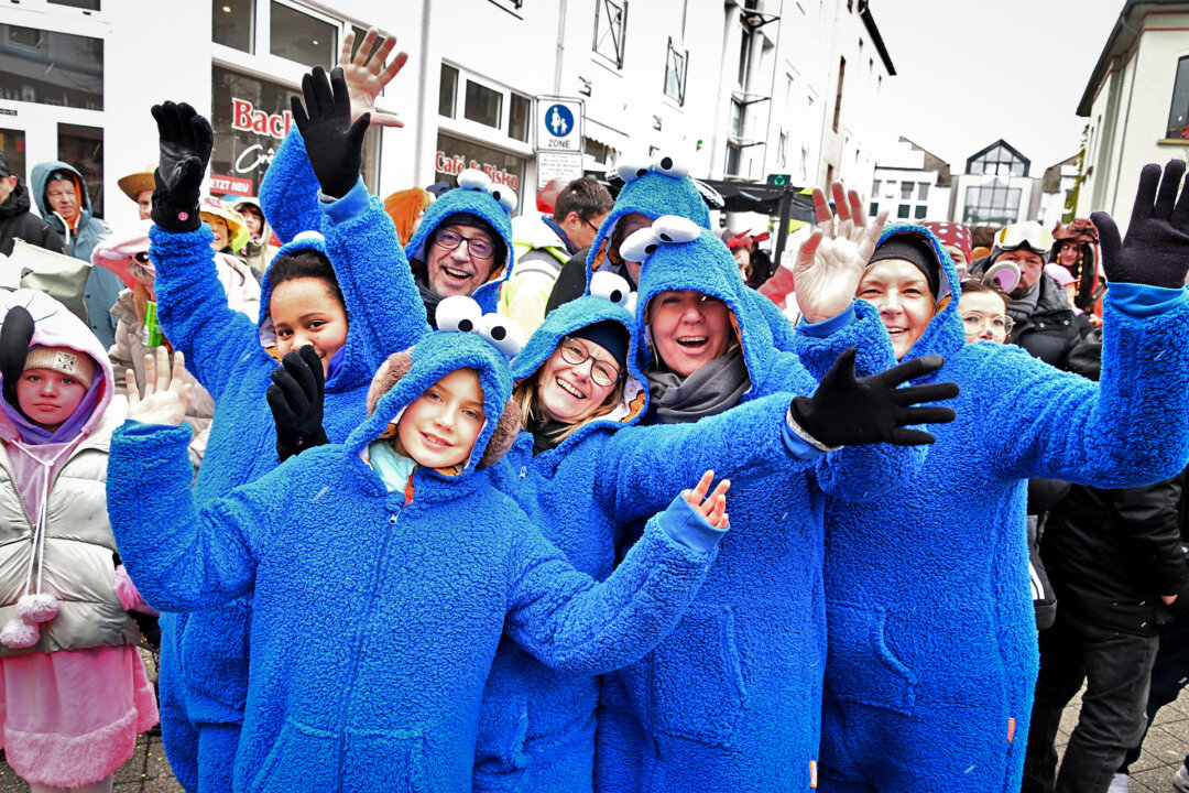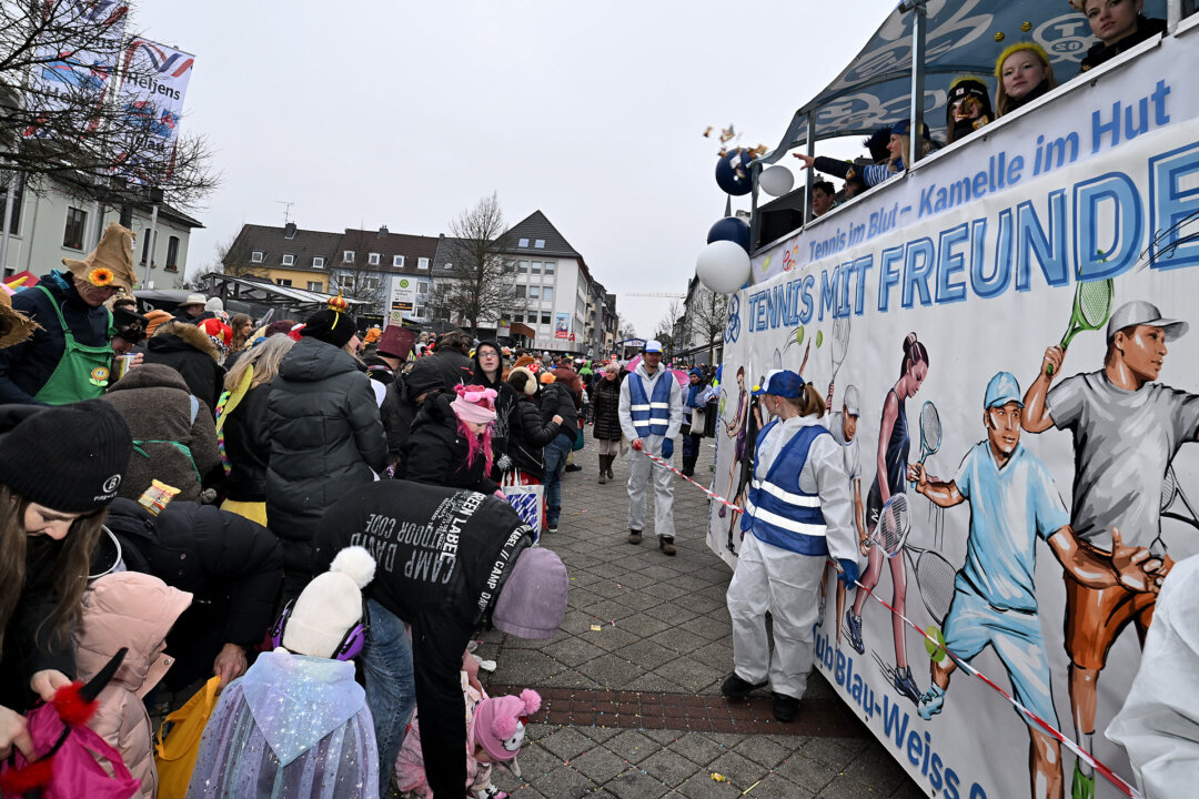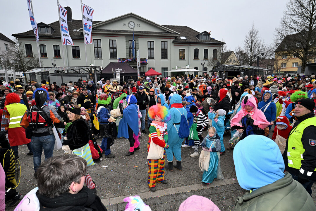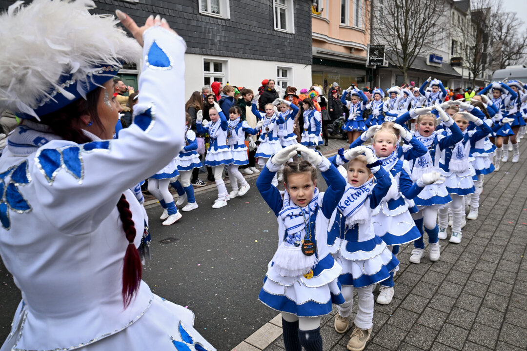 Anlässlich ihres karnevalistischen Vereinsjubiläums hatten die Heljens-Jecken ein beeindruckendes Teilnehmerfeld auf die Beine gestellt. Über 30 Wagen und Fußgruppen bahnten sich ihren Weg durch die Stadt – fast eine Stunde verging bis die Zugspitze nach dem Start um 14.11 Uhr den Rathausplatz erreichte. Den Auftakt machte wie gewohnt die Gruppe „Meet me at five“, dicht gefolgt vom Kettwiger Karnevals-Club samt Wagen und Garden, der Freiwilligen Feuerwehr und dem Bürgerbusverein.