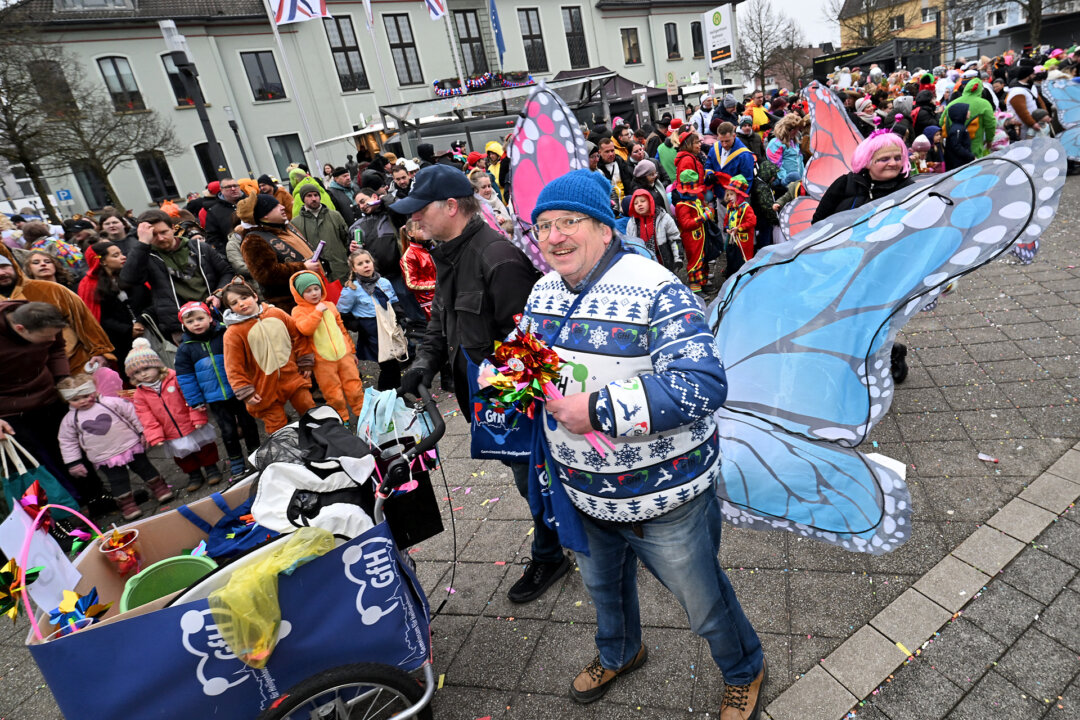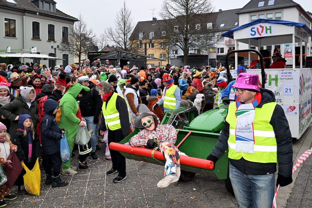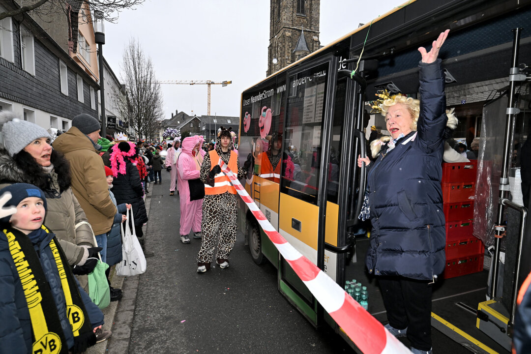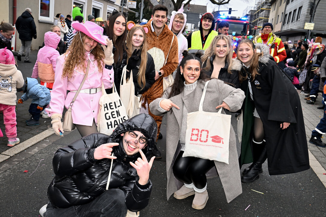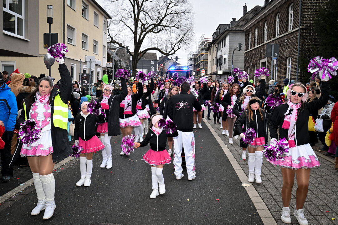 Anlässlich ihres karnevalistischen Vereinsjubiläums hatten die Heljens-Jecken ein beeindruckendes Teilnehmerfeld auf die Beine gestellt. Über 30 Wagen und Fußgruppen bahnten sich ihren Weg durch die Stadt – fast eine Stunde verging bis die Zugspitze nach dem Start um 14.11 Uhr den Rathausplatz erreichte. Den Auftakt machte wie gewohnt die Gruppe „Meet me at five“, dicht gefolgt vom Kettwiger Karnevals-Club samt Wagen und Garden, der Freiwilligen Feuerwehr und dem Bürgerbusverein.