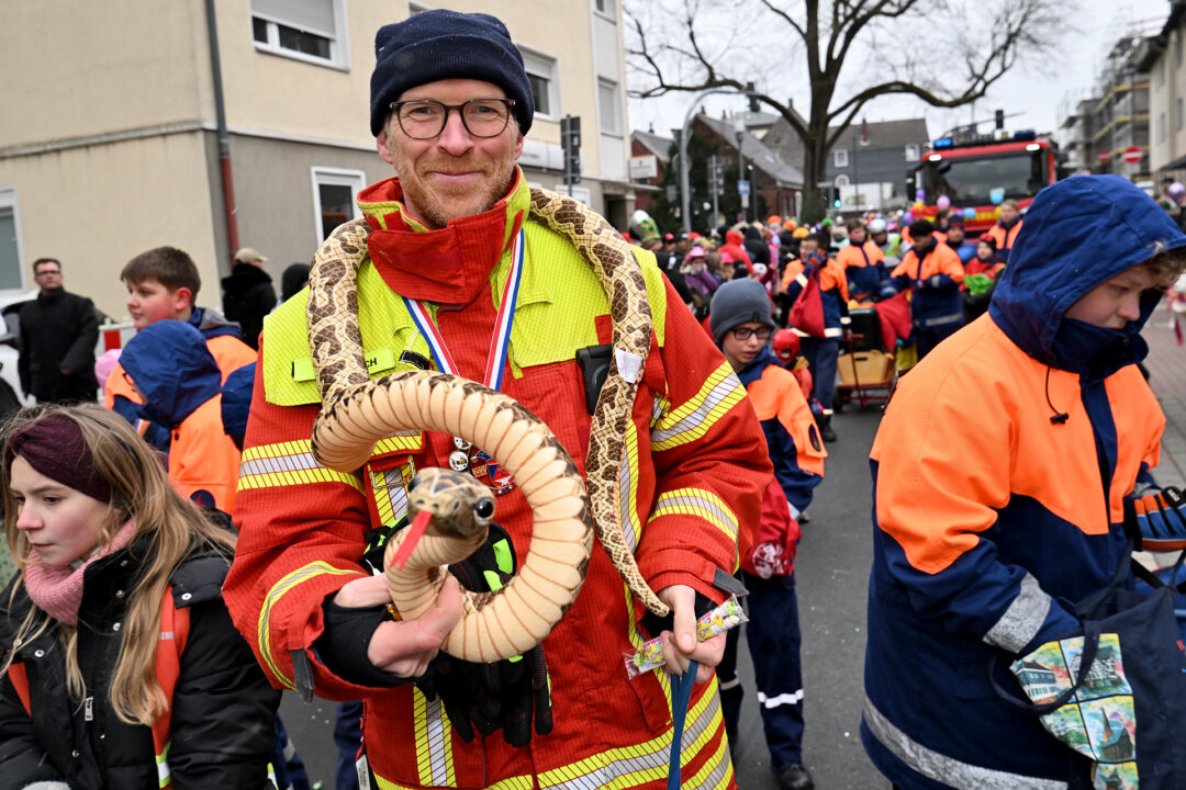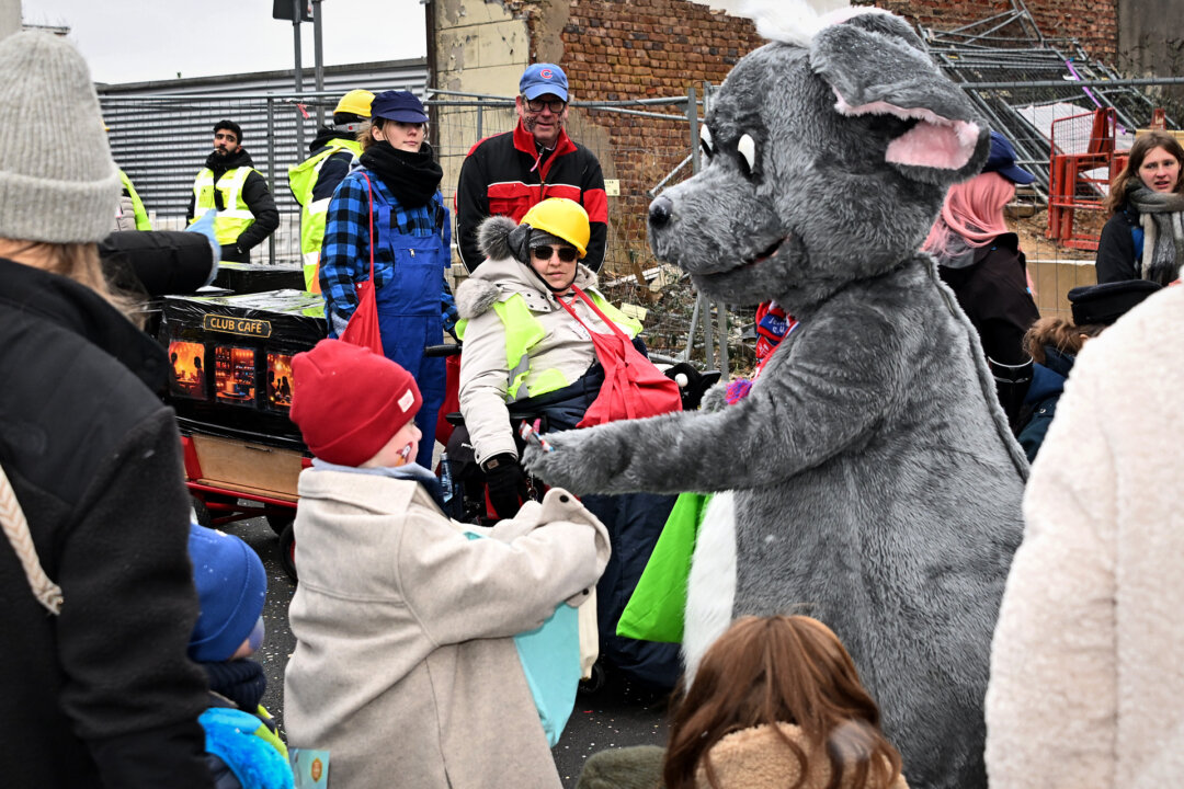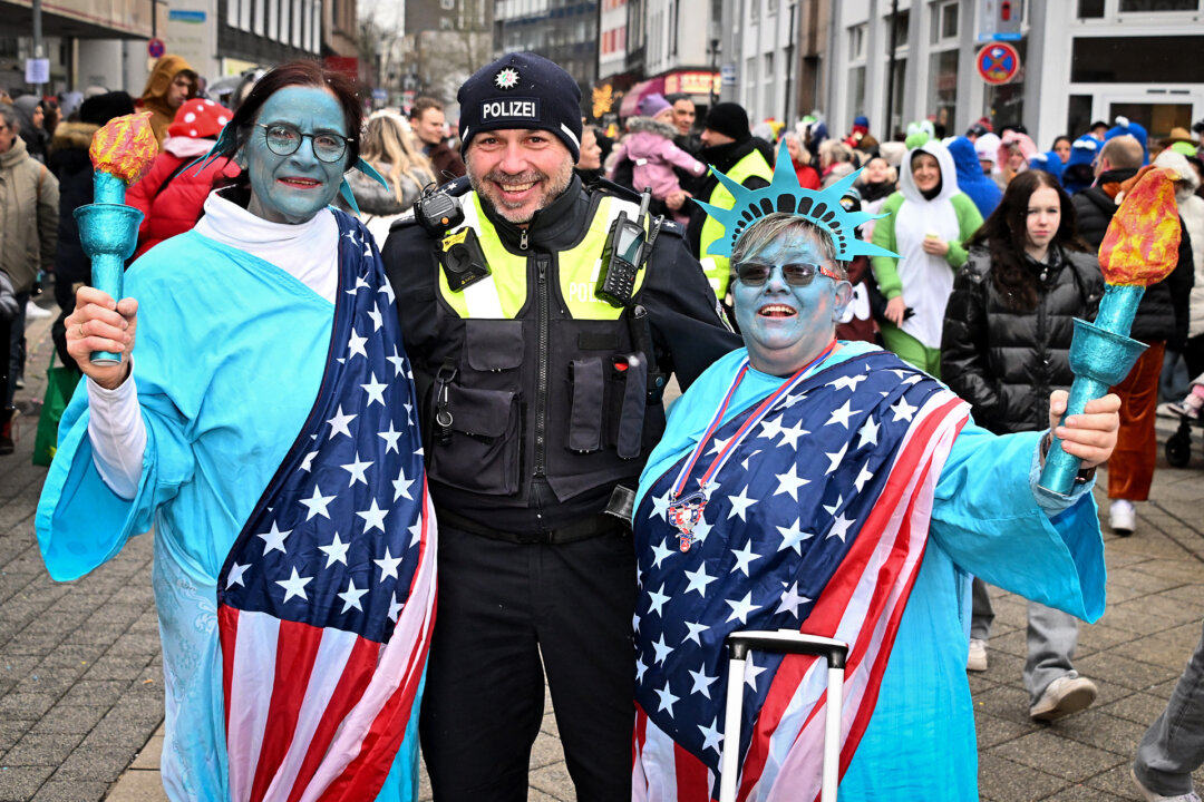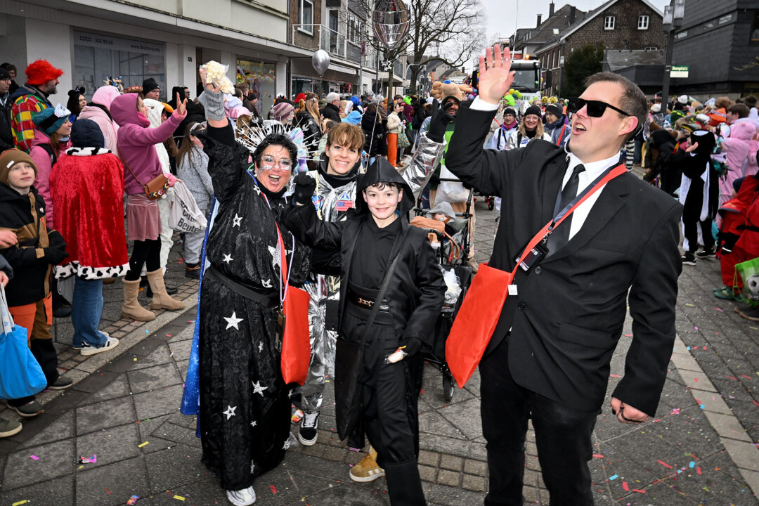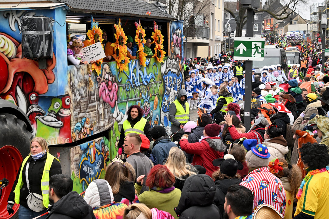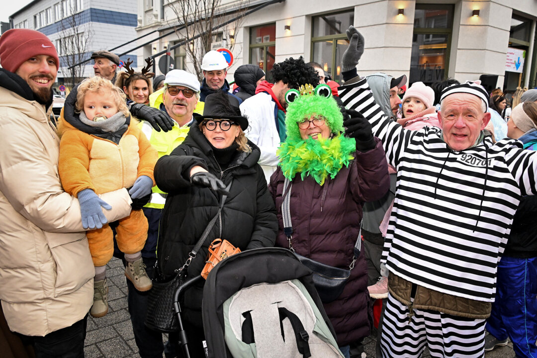 Anlässlich ihres karnevalistischen Vereinsjubiläums hatten die Heljens-Jecken ein beeindruckendes Teilnehmerfeld auf die Beine gestellt. Über 30 Wagen und Fußgruppen bahnten sich ihren Weg durch die Stadt – fast eine Stunde verging bis die Zugspitze nach dem Start um 14.11 Uhr den Rathausplatz erreichte. Den Auftakt machte wie gewohnt die Gruppe „Meet me at five“, dicht gefolgt vom Kettwiger Karnevals-Club samt Wagen und Garden, der Freiwilligen Feuerwehr und dem Bürgerbusverein.