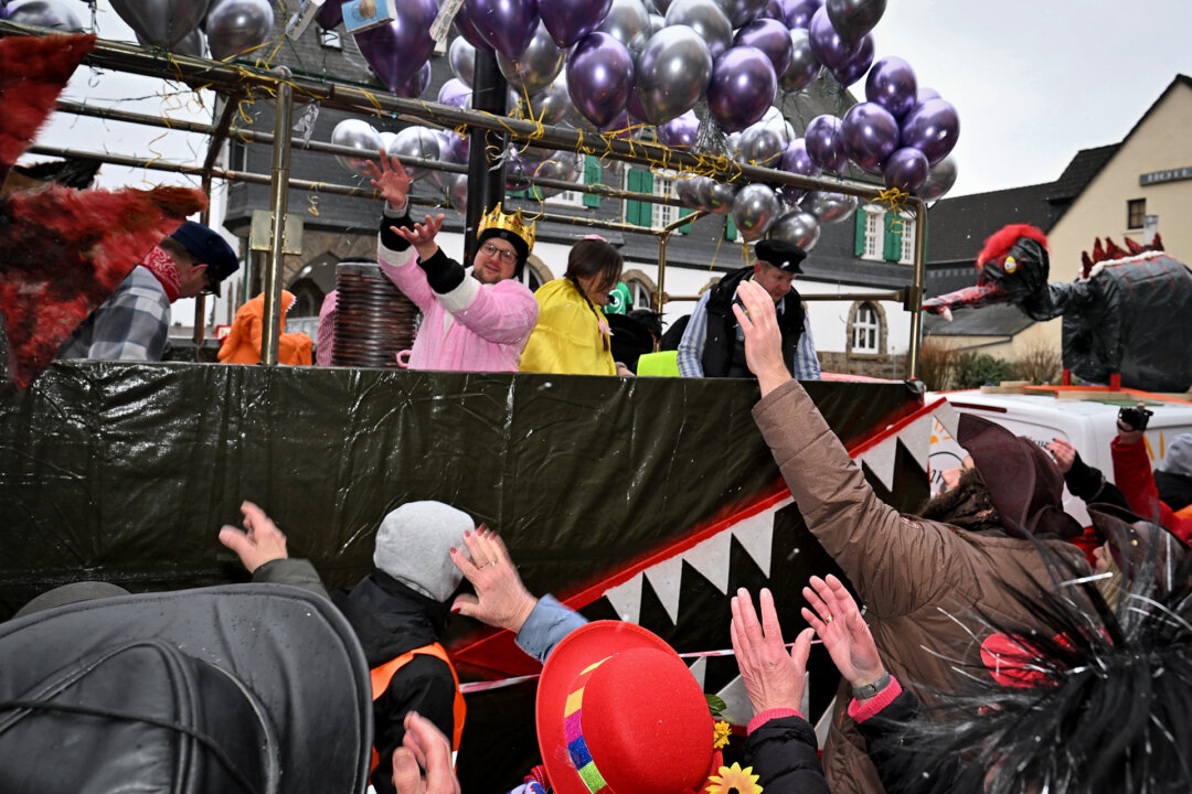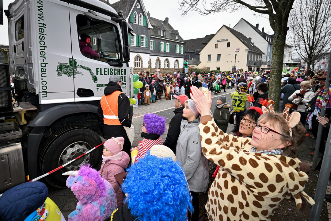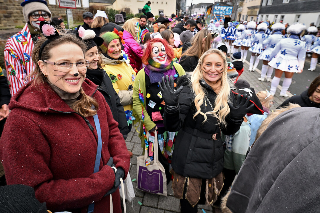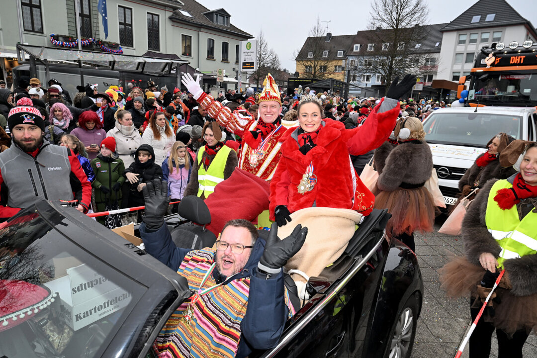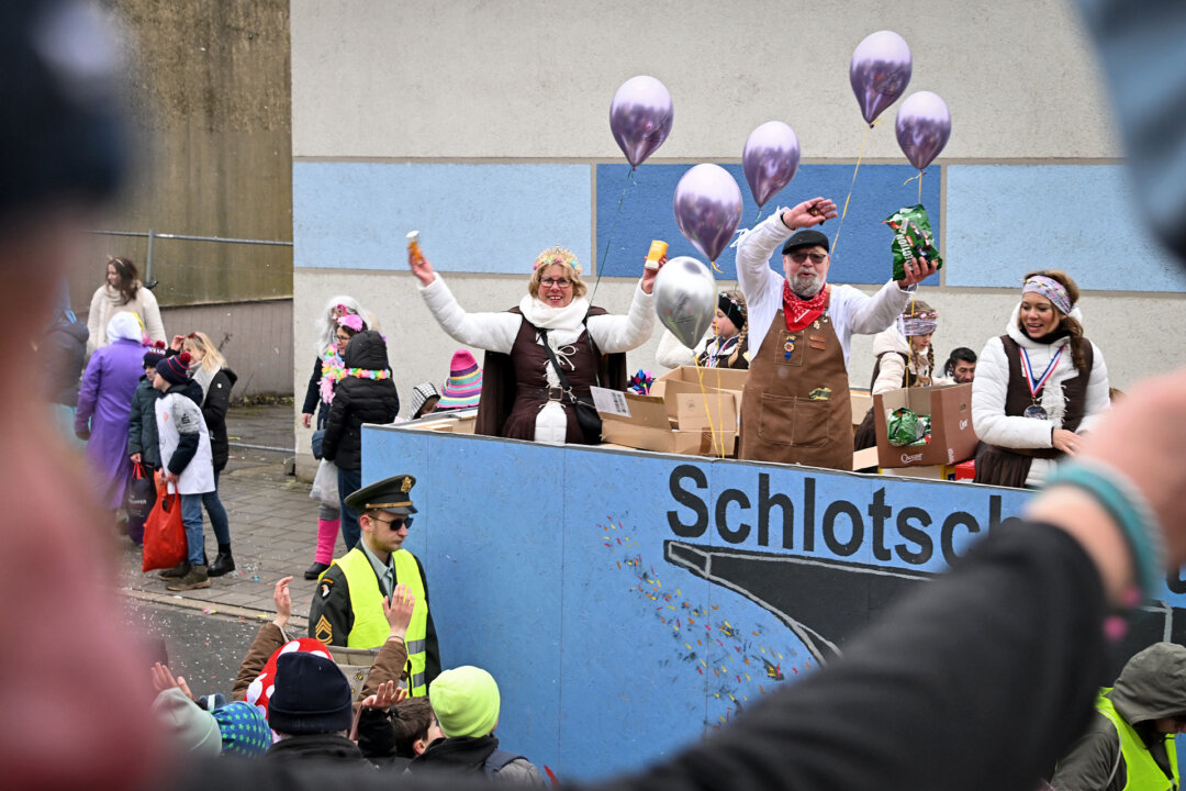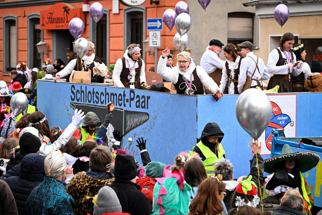 Wer der Kälte lange genug getrotzt hatte, wurde am Ende mit dem emotionalen Höhepunkt des Jubiläumsumzugs belohnt. Zum ersten Mal in der Geschichte der Stadt wurde ein eigenes Schlotschmet-Paar „ins Rennen geschickt“: Vom prachtvoll gestalteten Premierenwagen grüßten Christa I. und Heinz-Peter I. ihr närrisches Volk. Den krönenden Abschluss bildeten schließlich die Gastgeber selbst: Die Heljens-Jecken zogen mit ihrer Kinder- und Stadtgarde sowie dem Vorstand als furiose Finalnummer über die Hauptstraße.