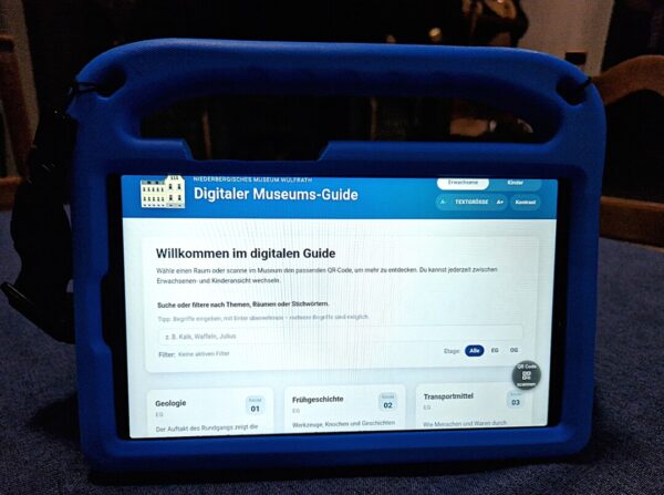 Der Trägerverein hat zunächst acht Tablets angeschafft, die in stoßfeste, blaue Hüllen eingesetzt sind und von den Besucherinnen und Besuchern um den Hals getragen werden können. Um störende Geräuschkulissen in den Räumen zu vermeiden, stehen Kopfhörer zur Verfügung. Alternativ können die Informationen über einen QR-Code auf das eigene Smartphone geladen und dort gehört oder gelesen werden.