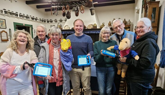 Ein Teil des Museums-Teams mit den neuen Tablets sowie Julius als Handpuppe und als Stofftier. Fotos: Kling
