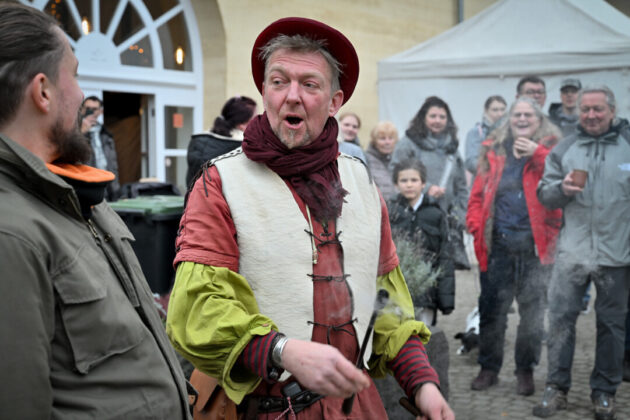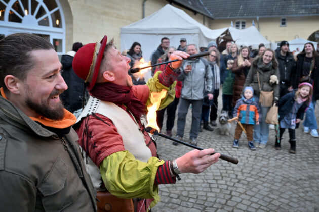 Neben dem Warenangebot sorgten Gaukler, Tanz und Musik für Unterhaltung. Einen “Taschendrachen” – “meist zu finden bei Leuten, die aus dem Maule qualmen, wie die Drachen selbst”, suchte Gaukler Tamino unter den Besucherinnen und Besuchern. Nach kurzer Suche fand sich ein Feuerzeug, nach dem er verlangt hatte. Damit entzündete er Fackeln, um sie anschließend gekonnt mit dem Mund wieder zu erlöschen – ein beeindruckendes Schauspiel, dass die Anwesenden mit viel Beifall bedachten.