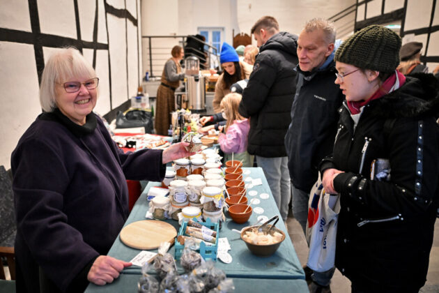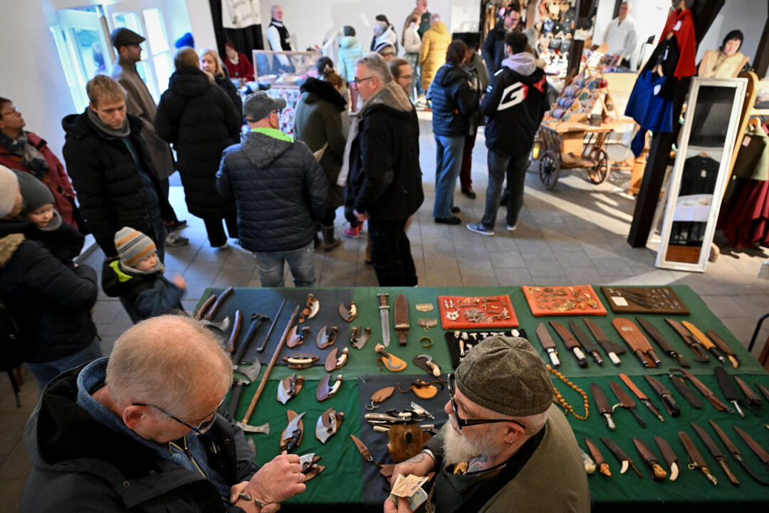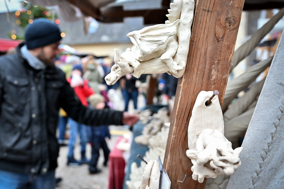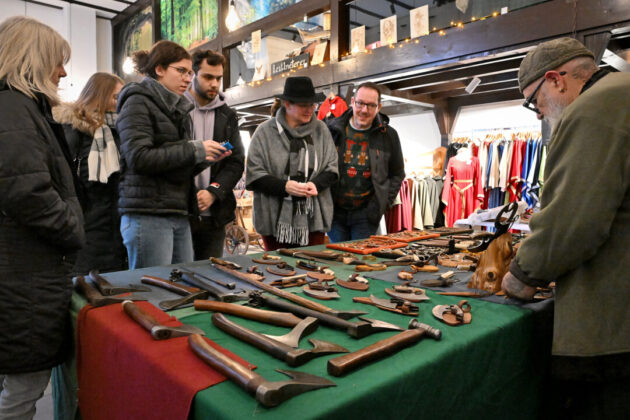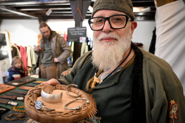 Zwischen Geschmeide und allerlei Kunsthandwerk hatte auch Hobbysilberschmied Gernot Lindlar aus Kürten seinen Stand aufgebaut. Er mache das seit 20 Jahren, berichtet er, beim Mittelalter-Weihnachtsmarkt in Neviges sei er von Anfang an dabei. “Ein schöner Markt. Klein, nicht so hektisch, man kann sich gut mit den Besuchern unterhalten”, sagt der Rentner. Viel Geld verdiene man damit nicht, aber er müsse ja nicht davon leben. Er freut sich, wenn er Menschen trifft, denen die Dinge gefallen, die er in seiner eigenen Werkstatt herstellt.