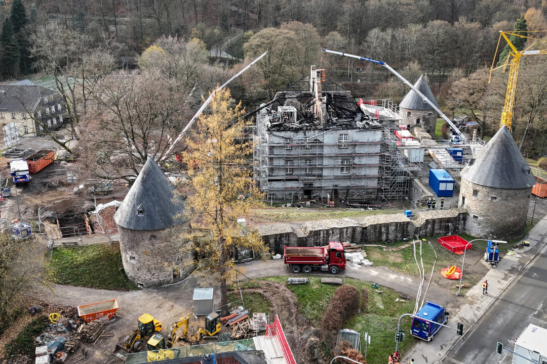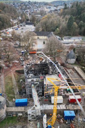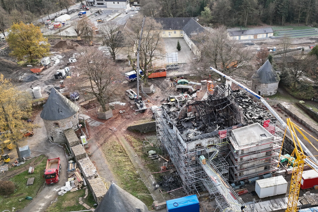 Velbert. Der Dachstuhl des Herrenhauses von Schloss Hardenberg in Velbert-Neviges ist komplett abgebrannt. Seit dem frühen Morgen des 21. November ist die Feuerwehr Velbert mit rund 100 Kräften im Einsatz, unterstützt von Einsatzkräften aus den umliegenden Städten. Auch am heutigen Samstag – und vermutlich noch bis tief in die Nacht hinein – bleibt die Bernsaustraße für den Verkehr gesperrt.