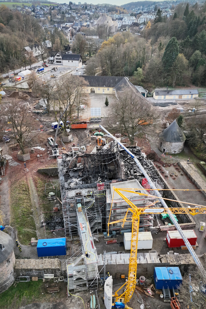 Mit mehreren Kränen versuchen Einsatzkräfte verkohlte Teile des abgebrannten Dachstuhls des Herrenhauses von Schloss Hardenberg abzutragen. Foto: Mathias Kehren