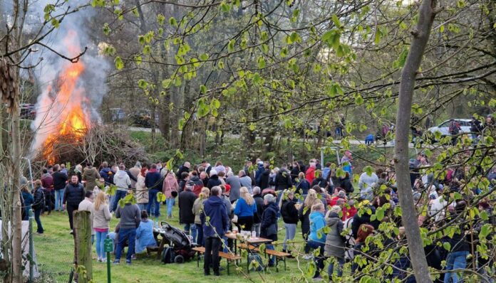 Erst qualmte es ein wenig, dann stiegen die Flammen bilderbuchmäßig empor, wie es sich für ein anständiges Osterfeuer gehört. Und als die Abendsonne noch ein letztes Licht auf die Szenerie warf, war es fast zu schön, um wahr zu sein.