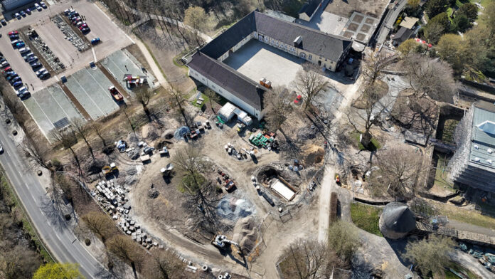 Auf der Schloss-Wiese (vorn) lagern noch Baumaterialien und Maschinen, dafür ist der angrenzende Parkplatz so gut wie fertig. Foto: Mathias Kehren