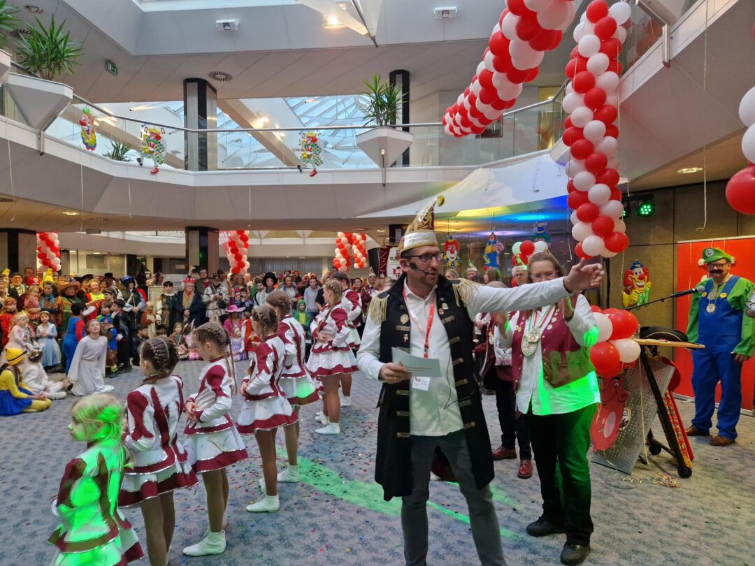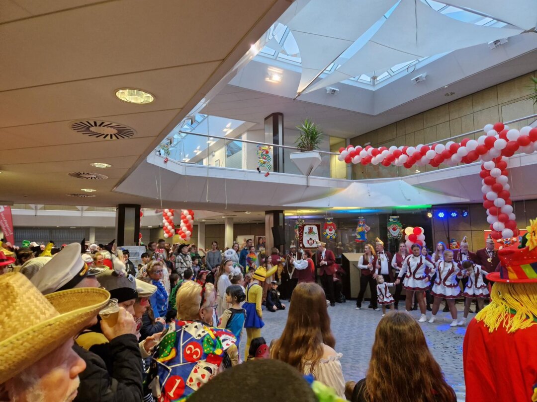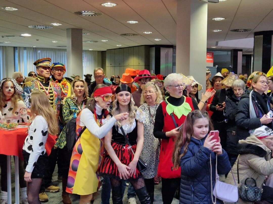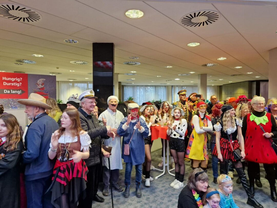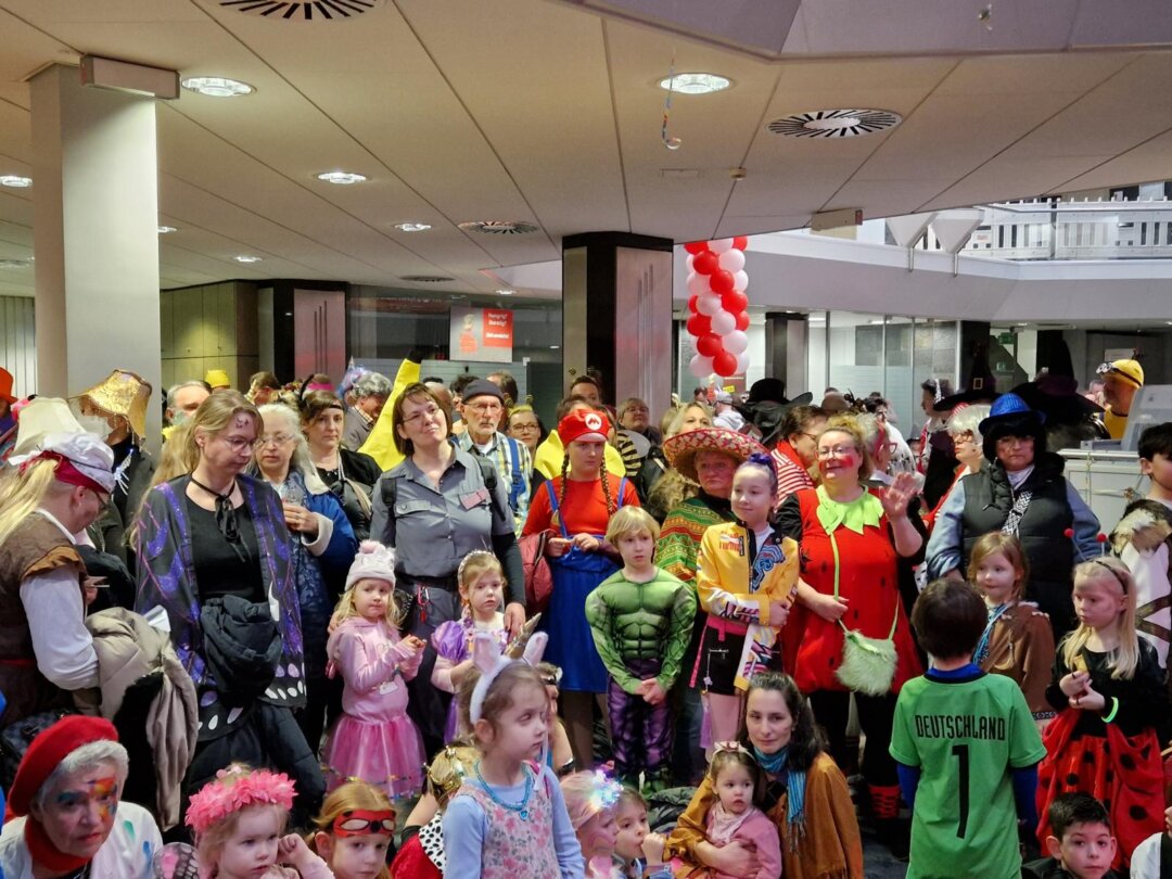 Das Duo „Albatros“ spielte den Klassiker „Wenn et Trömmelche jeht“ zum Einzug der Närrinnen und Narren, den Refrain „Kölle alaaf“ umgetextet auf „Wülfrath helau“. Dann stürmten die Kostümierten herbei, um sich einen guten Platz in der Kassenhalle zu sichern.