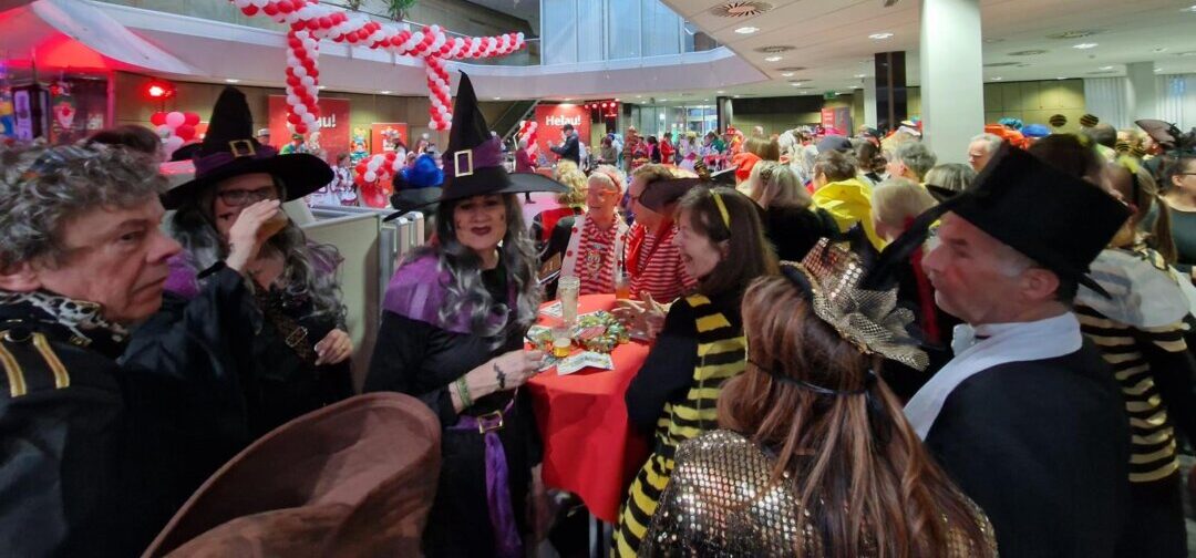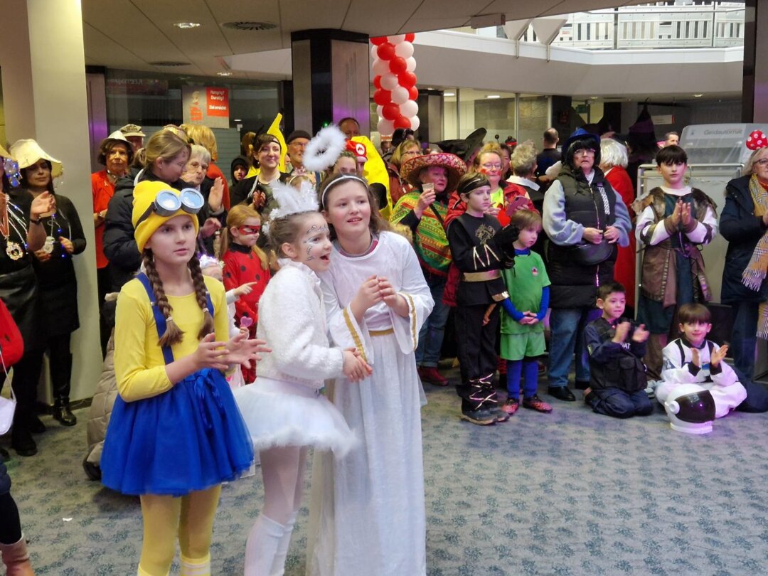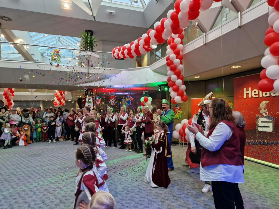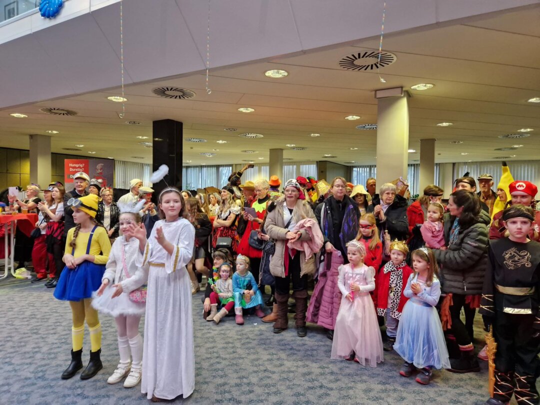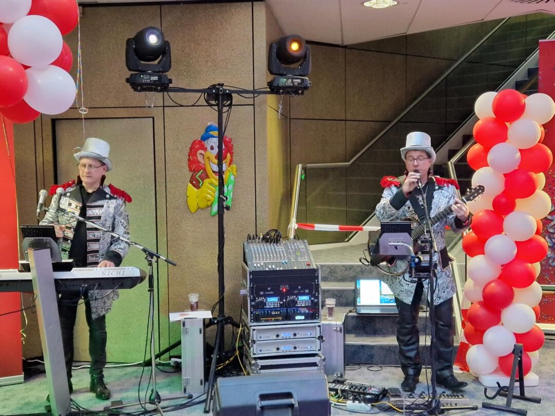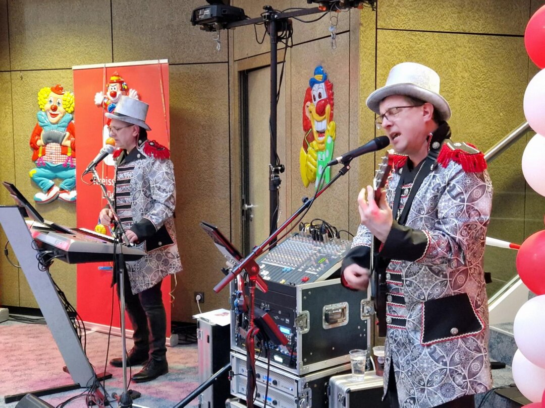 Das Duo „Albatros“ spielte den Klassiker „Wenn et Trömmelche jeht“ zum Einzug der Närrinnen und Narren, den Refrain „Kölle alaaf“ umgetextet auf „Wülfrath helau“. Dann stürmten die Kostümierten herbei, um sich einen guten Platz in der Kassenhalle zu sichern.