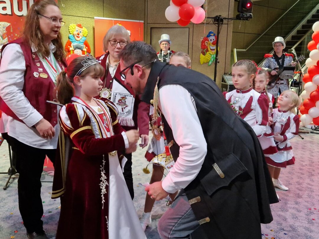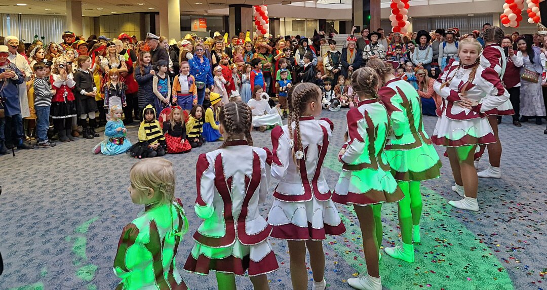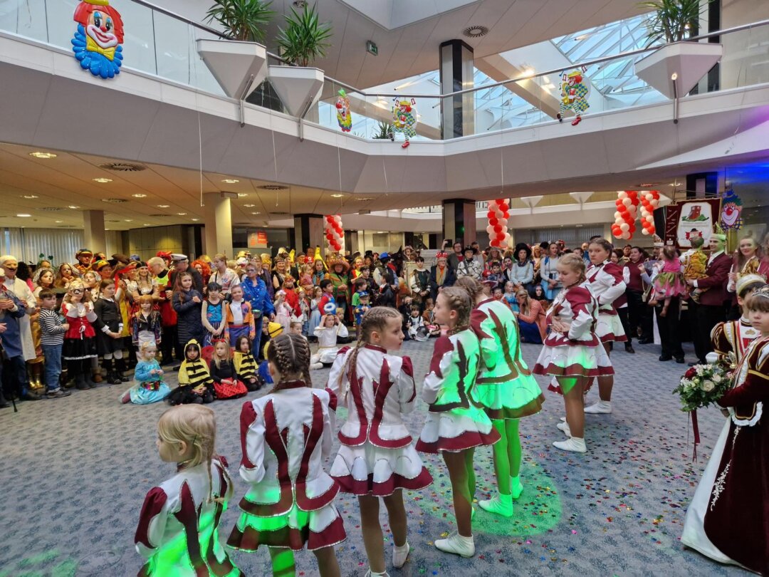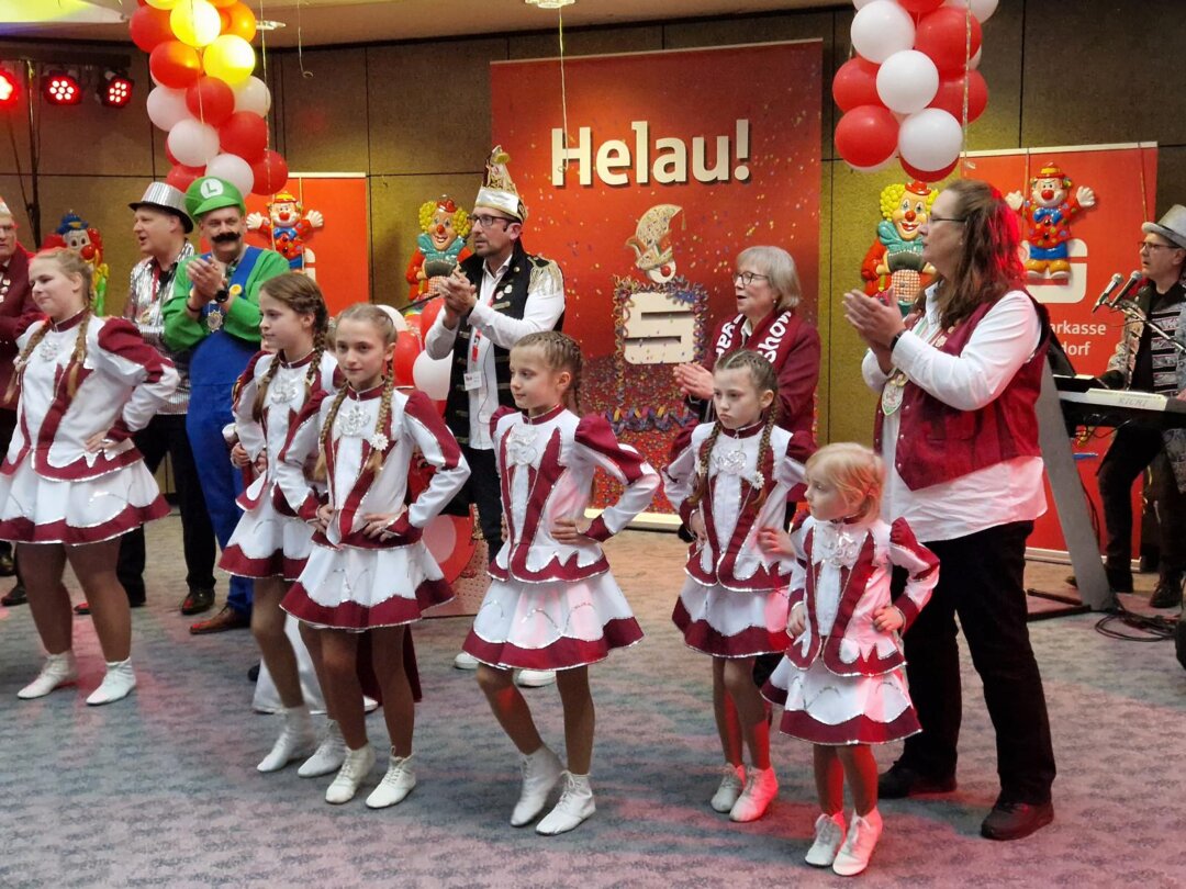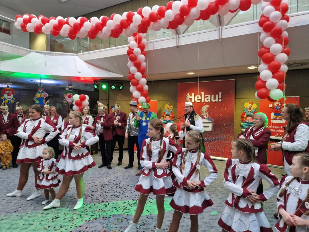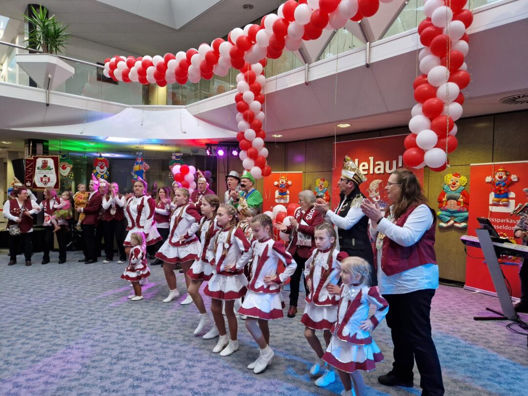 „Familienkarneval“ hatte die Kreissparkasse den diesjährigen Sturm auf „dat Spardösken“ überschrieben. Neben den jungen Tänzerinnen und Tänzern der Kalkstadt-Narren präsentierte sich auch die Tanzgarde Grün-Weiß aus Velbert.
