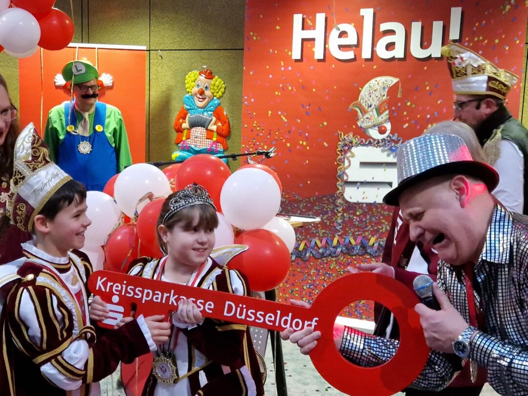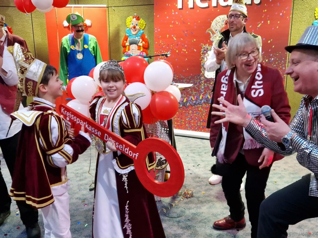 Thomas Meuser von der Sparkasse hatte diesmal Verstärkung aus Düsseldorf mitgebracht. Aber auch der stellvertretende Vorstandsvorsitzende Svend Reuse konnte nicht verhindern, dass das Kinderprinzenpaar Ben I. und Lisa I. ihm den überdimensionierten Schlüssel entriss und im Namen der Kalkstadt-Narren die Regentschaft über den „Moneytempel“ übernahm.