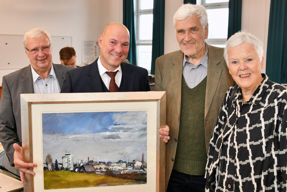 Wolfgang K. Schlieper, Bürgermeister Dirk Lukrafka, Klaus Fußmann und seine Frau Barbara bei der Übergabe der Gemälde. Foto: Mathias Kehren