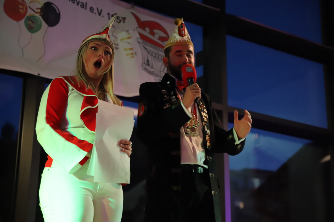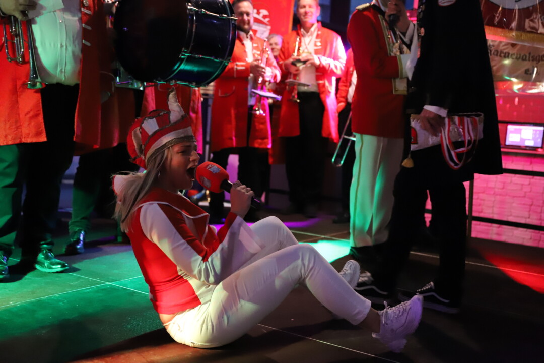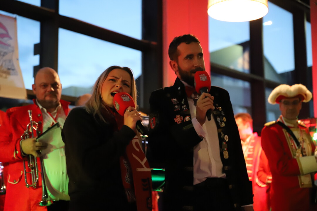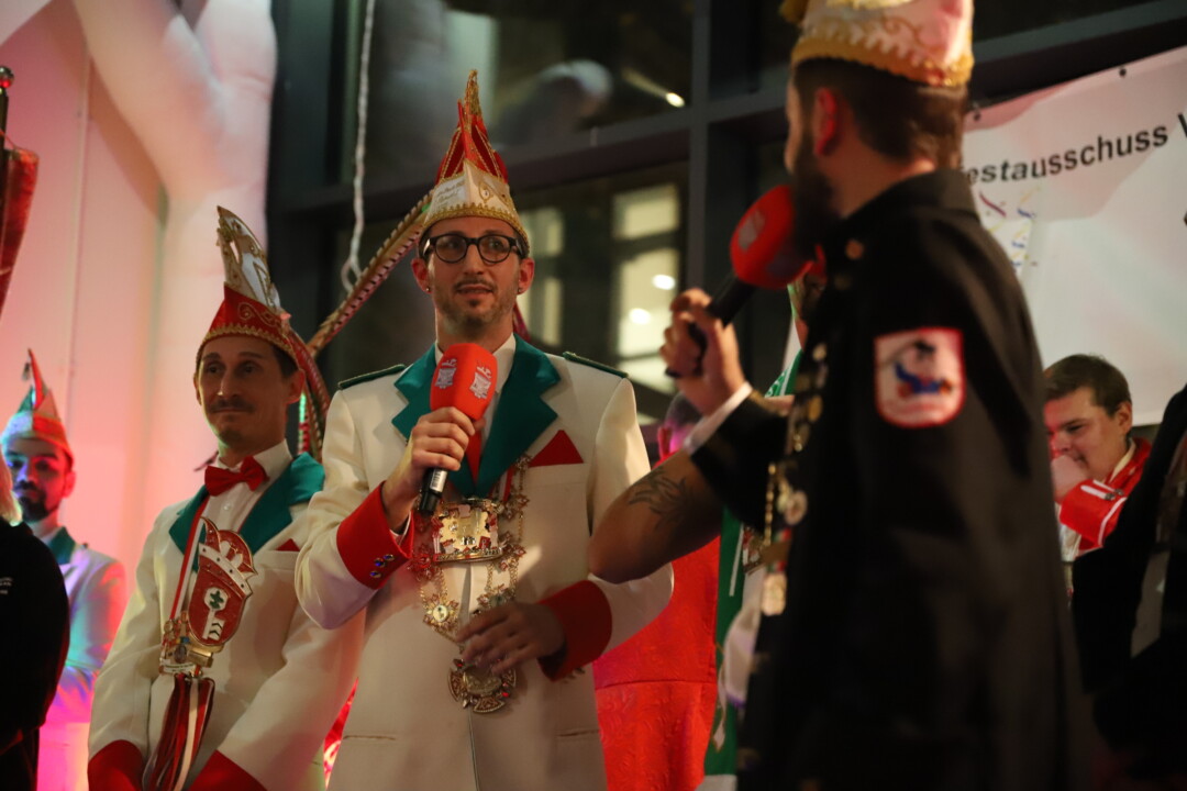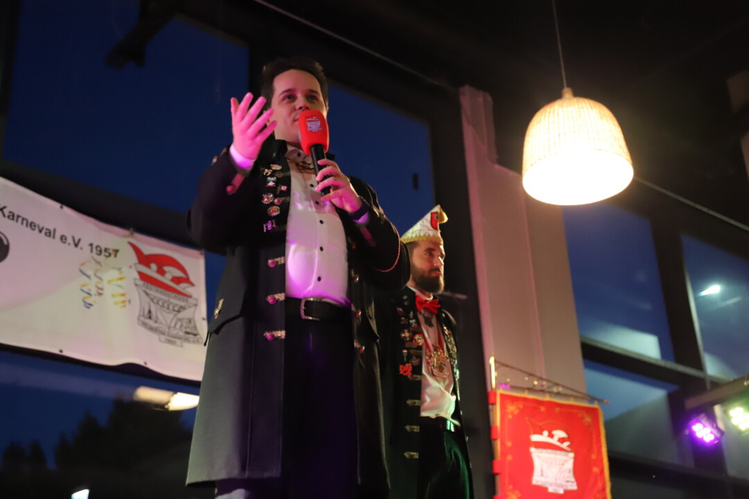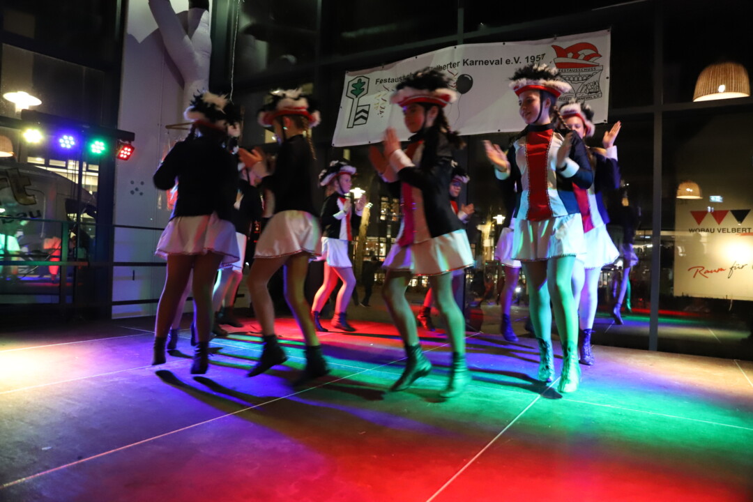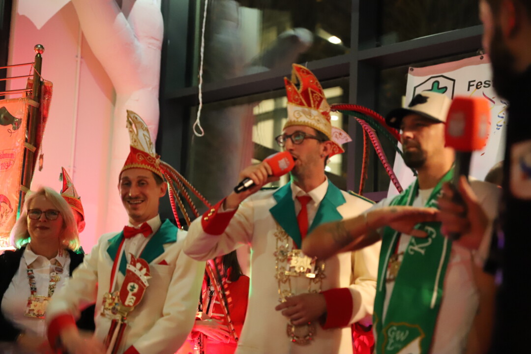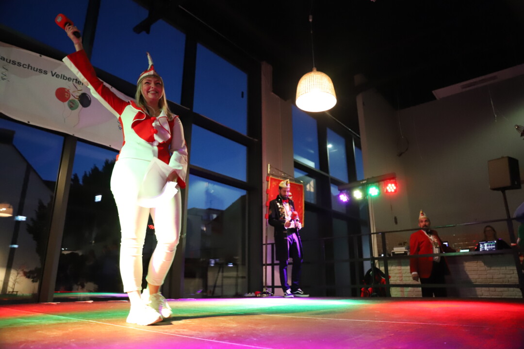 Mit gewohnt spitzer Zunge sorgte Kathi Hochmuth für Stimmung im Festsaal. Vom Vatikan über den Louvre-Diebstahl bis hin zum Bundeskanzler – es hagelte Hohn und Spott. Dann wurde es kurz emotional. “Danke, dass ich euch Hoppe sein durfte für zwölf Jahre”. Dafür gab es großen Applaus. “Und nun ist alles außer Rand und Band, denn Velbert ist in Narrenhand!”. Der Karneval in der Schlösserstadt war damit eröffnet.