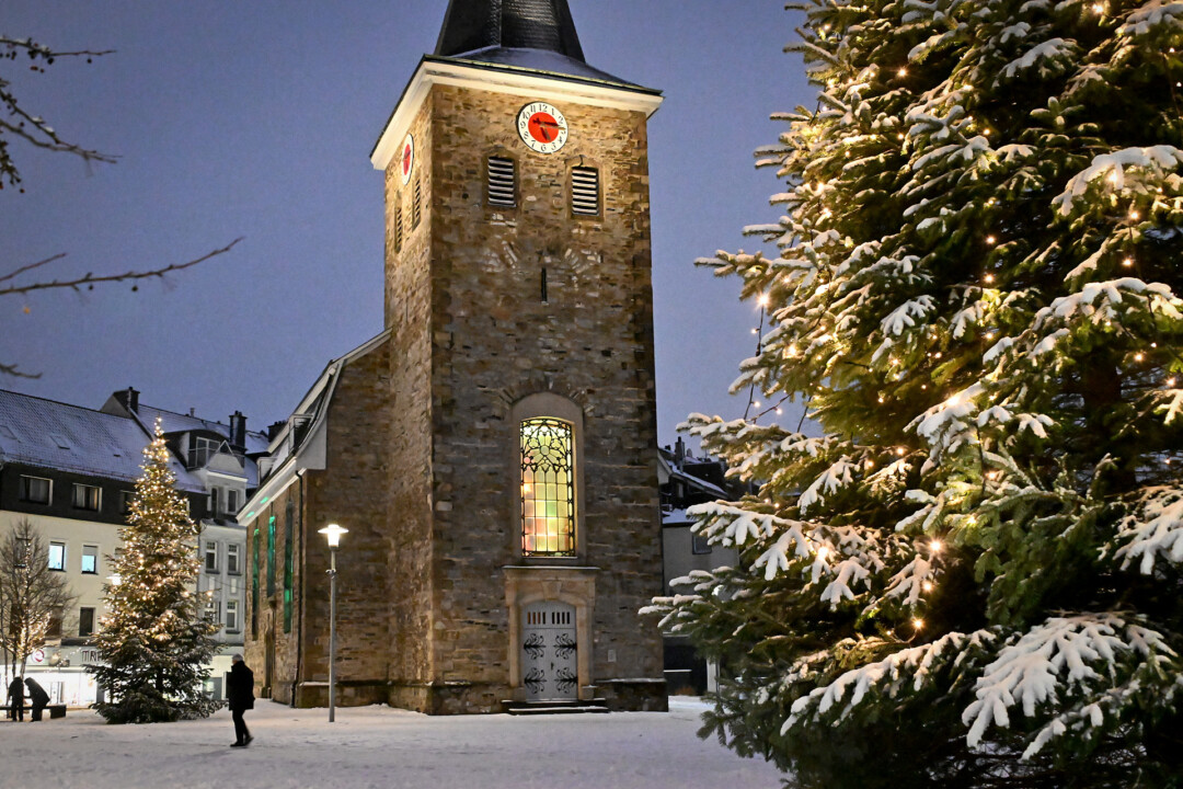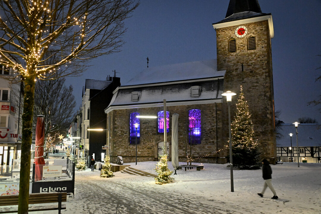 Besonders stimmungsvoll präsentierte sich am Abend die Velberter Innenstadt. Wo noch die Weihnachtsbeleuchtung strahlte, bot sich an der Alten Kirche und dem Platz Am Offers ein Bild mit wahrem Postkartencharme – eine verspätete „weiße Weihnacht“ im Januar.